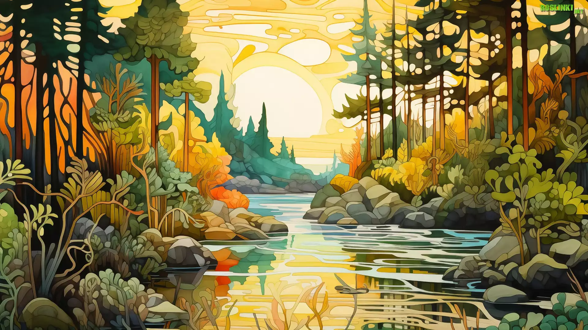 Rośliny: Grafika, Rzeka, Drzewa, Kamienie, Rośliny