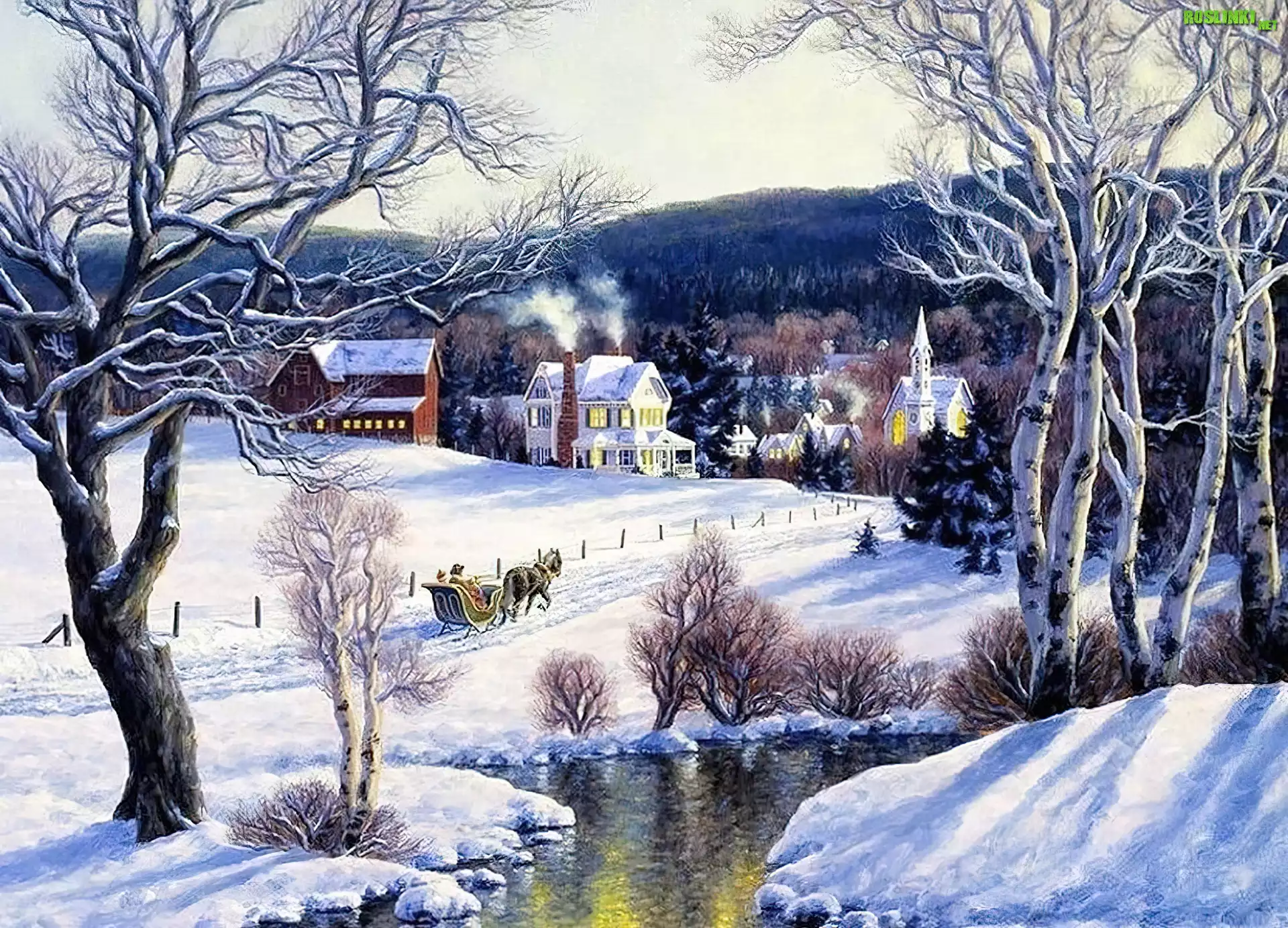 Rośliny: Rzeka, Droga, Sanie, Drzewa, Zima