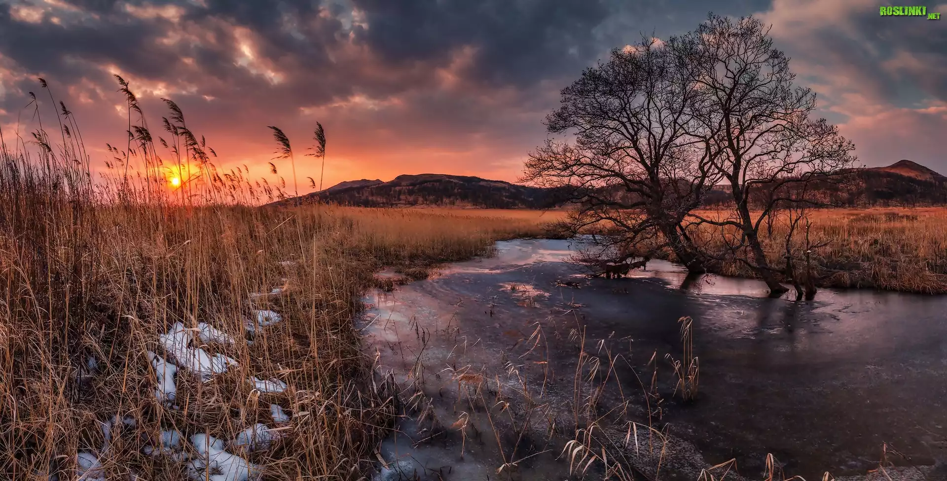 Rośliny: Rzeka, Zachód słońca, Trawy, Drzewa, Wzgórza