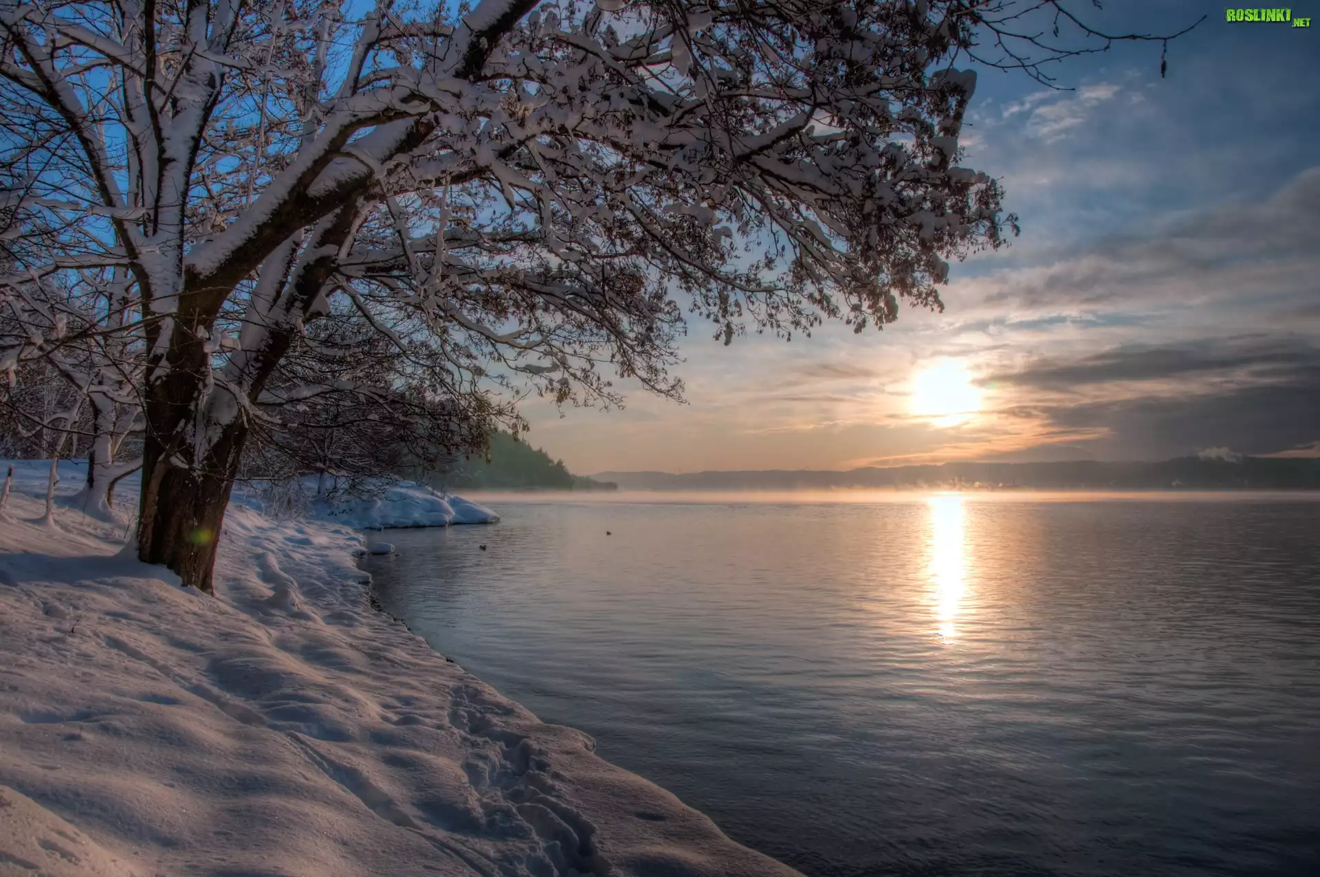 Rośliny: Rzeka, Zachód, Słońca, Drzewa, Śnieg