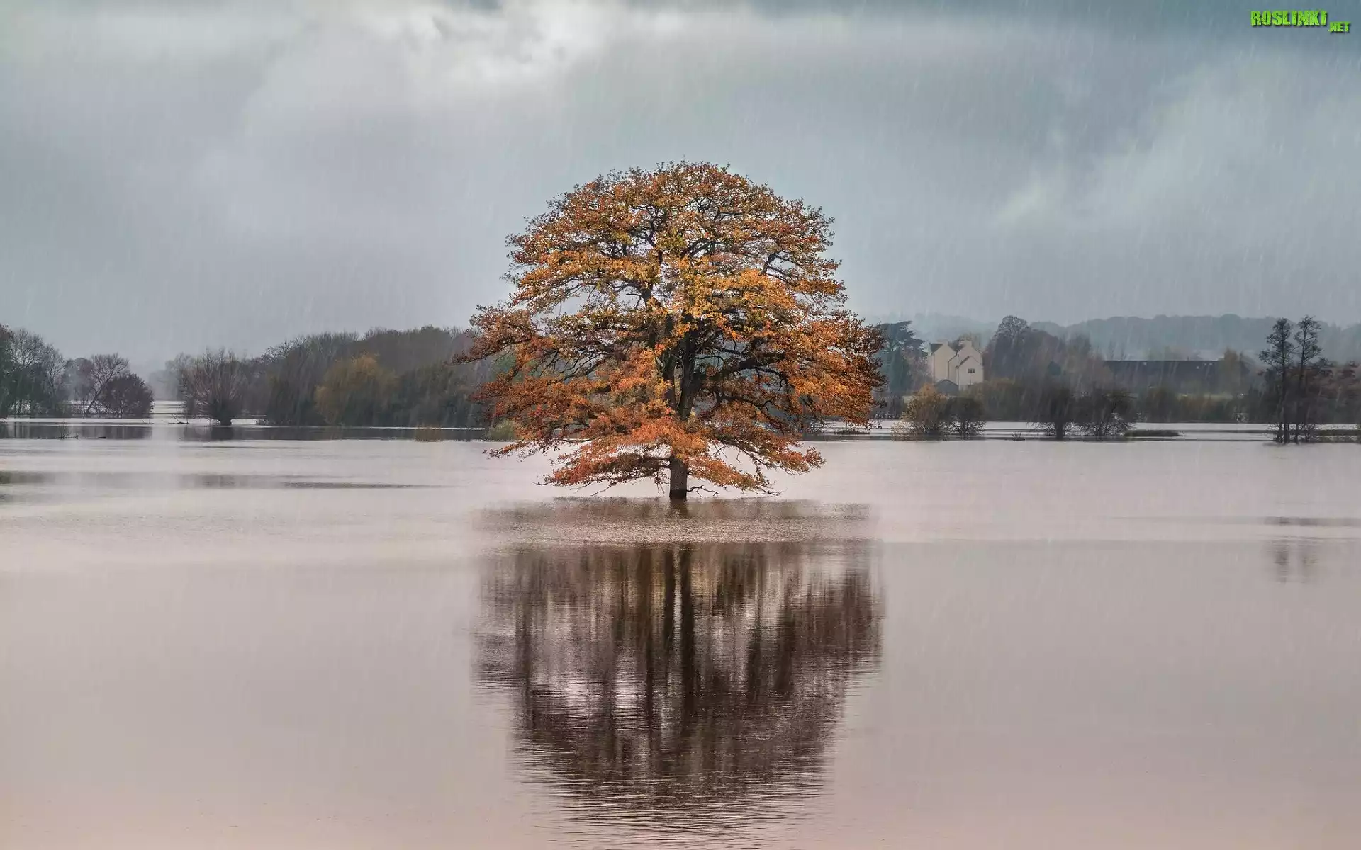 Rośliny: Rzeka, Jesień, Deszcz, Drzewo, Domy