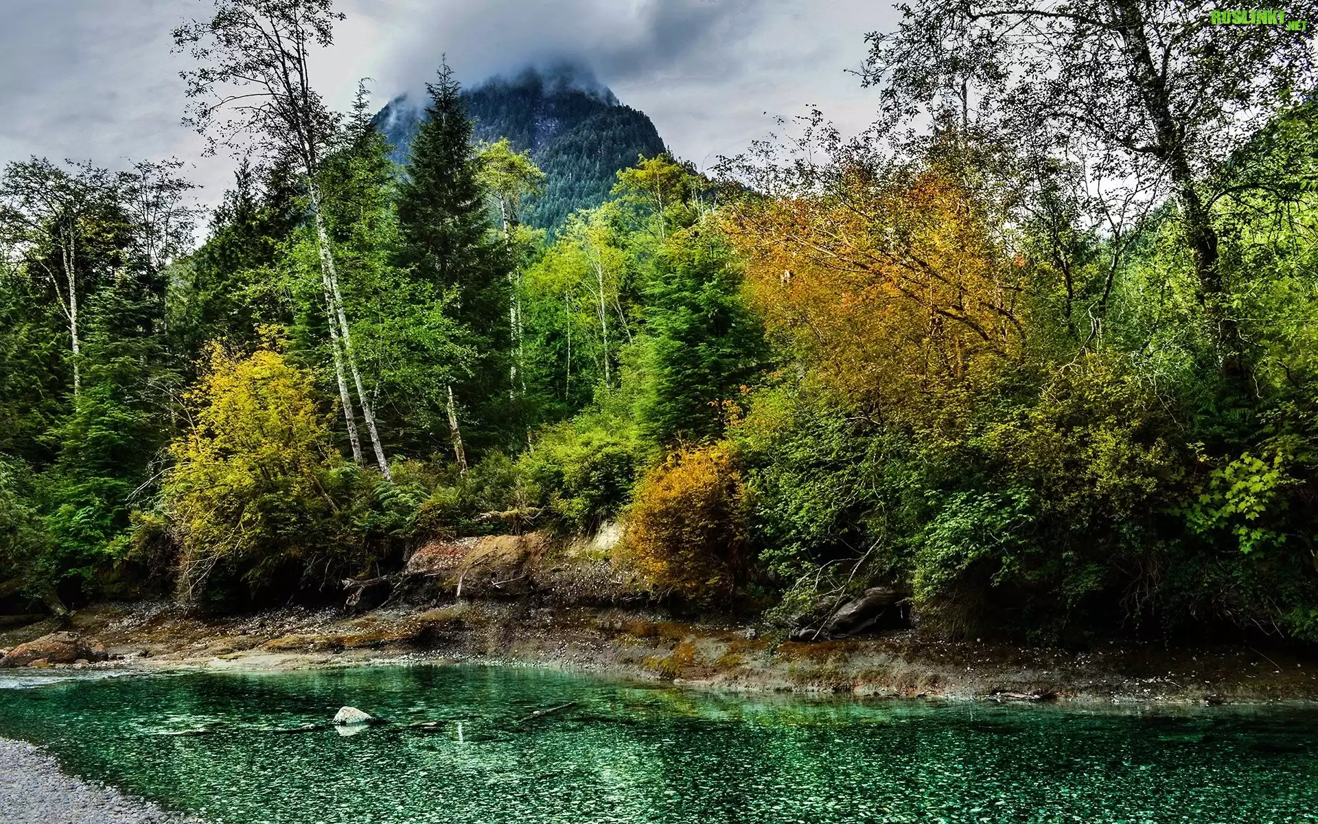 Rośliny: Rzeka, Drzewa, Góra, Mgła