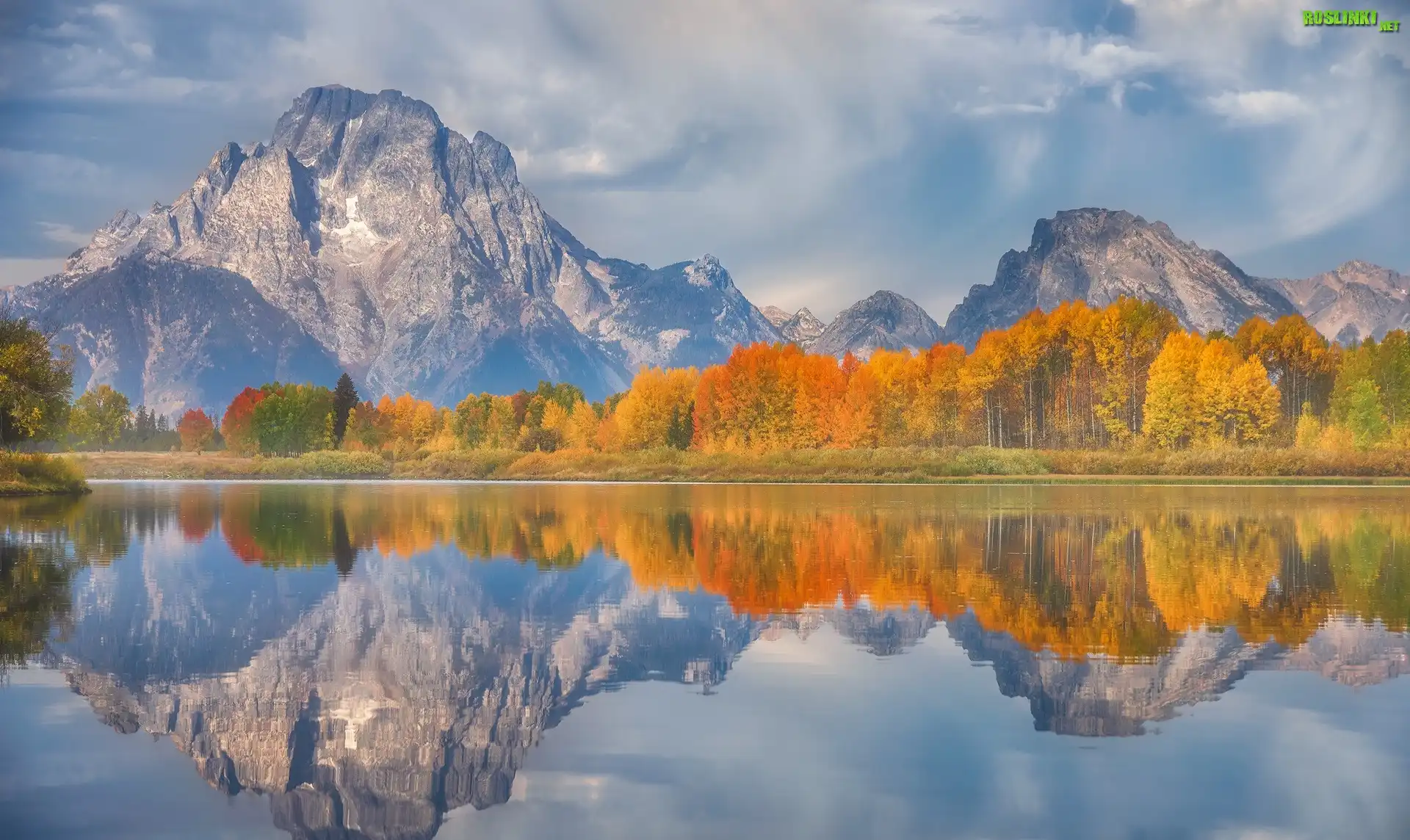 Drzewa, Jesień, Góry, Teton Range, Rzeka, Snake River, Chmury, Odbicie, Park Narodowy Grand Teton, Stan Wyoming, Stany Zjednoczone |