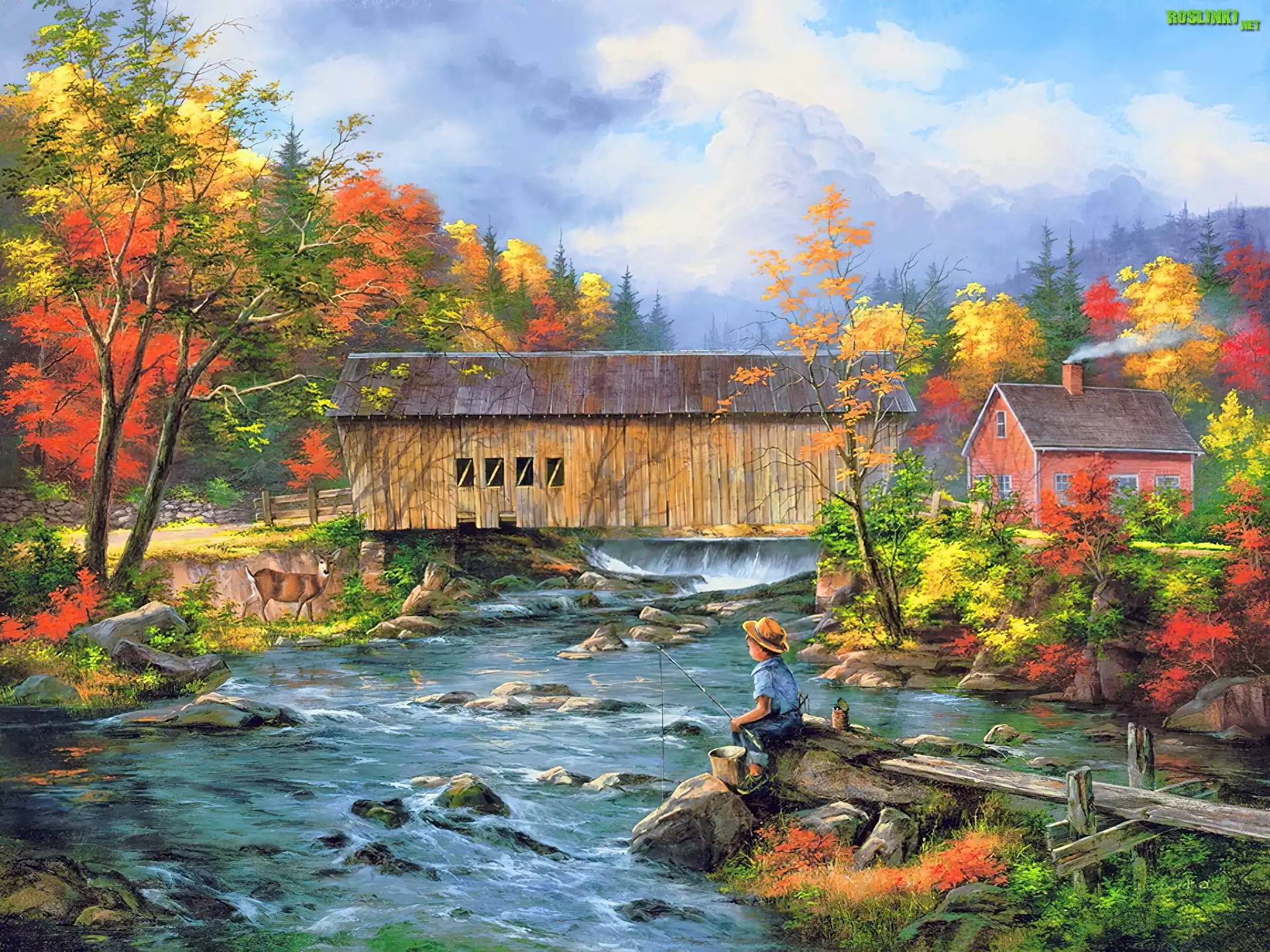 Rośliny: Rzeka, Pomost, Chłopiec, Jesień, Drzewa
