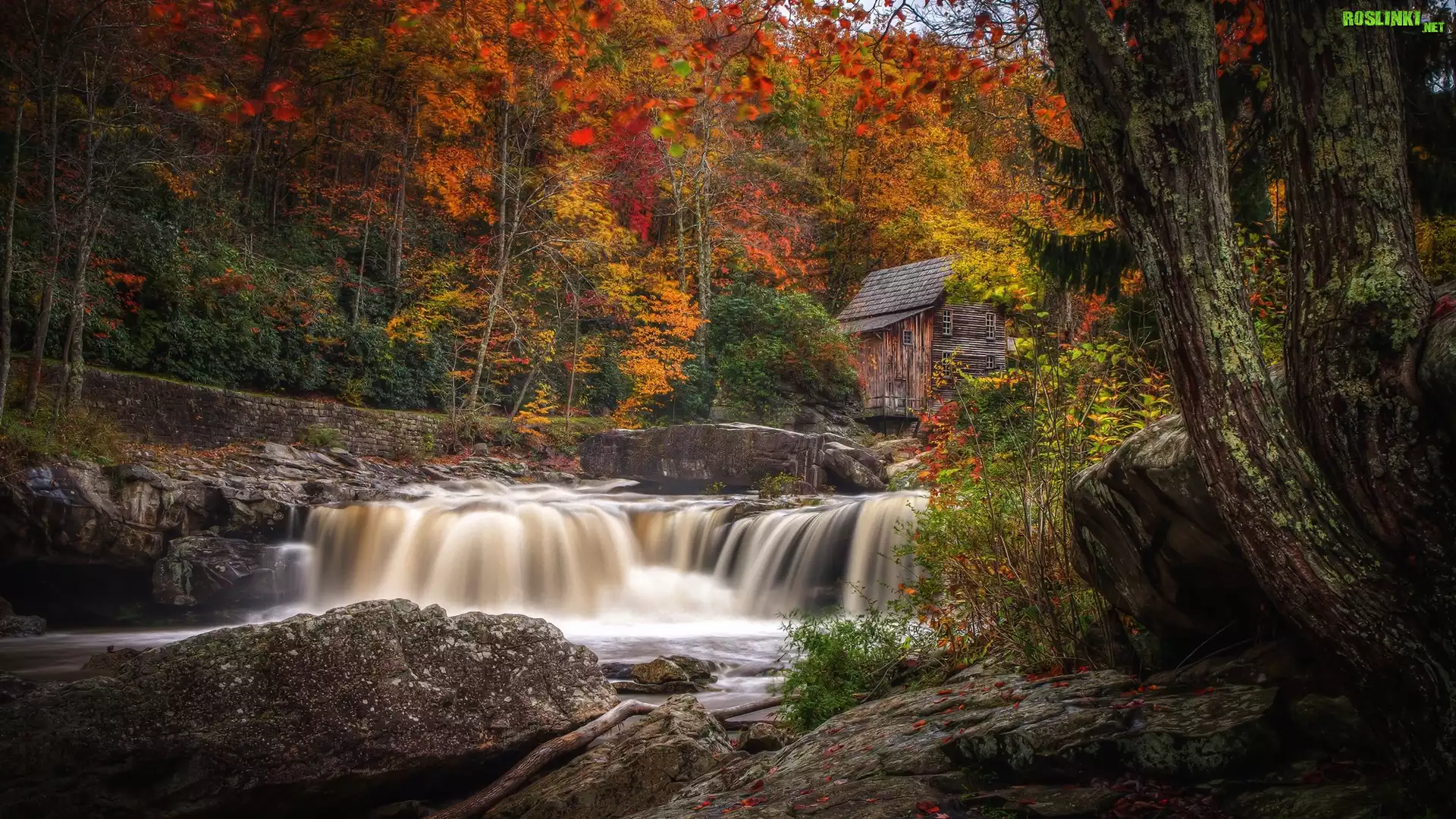 Rośliny: Drzewa, Rzeka, Kaskada, Skały, Kamienie, Młyn, Las, Jesień