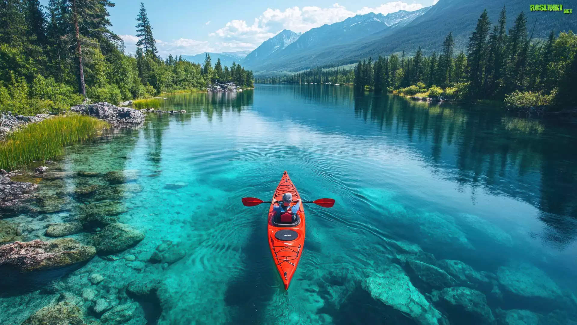 Rośliny: Góry, Rzeka, Kajak, Człowiek, Drzewa