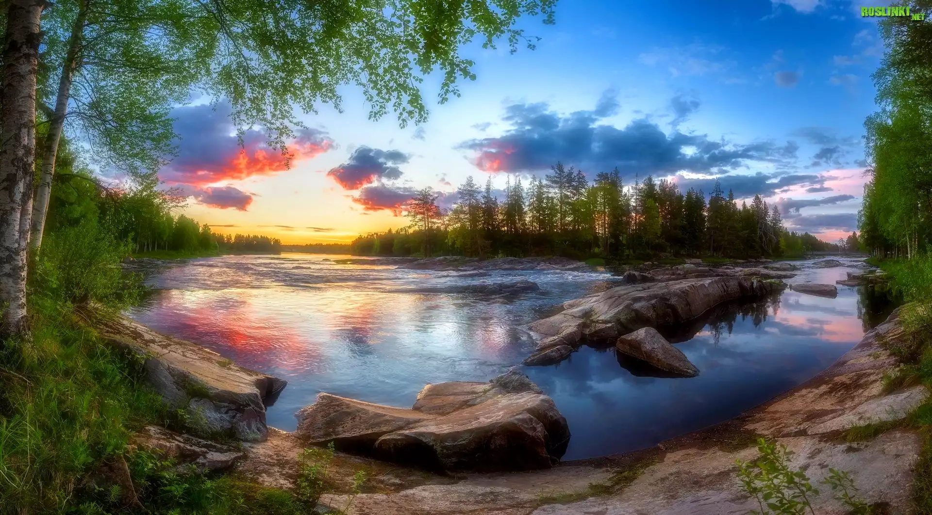 Rośliny: Rzeka, Drzewa, Kamienie, Chmury