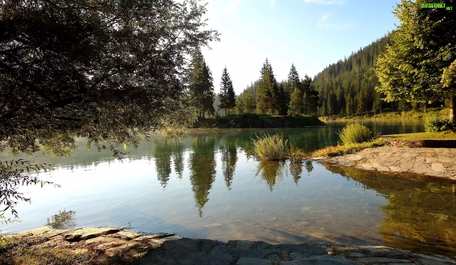 Rośliny: Rzeka, Las, Drzewa, Kamienie, Odbicie