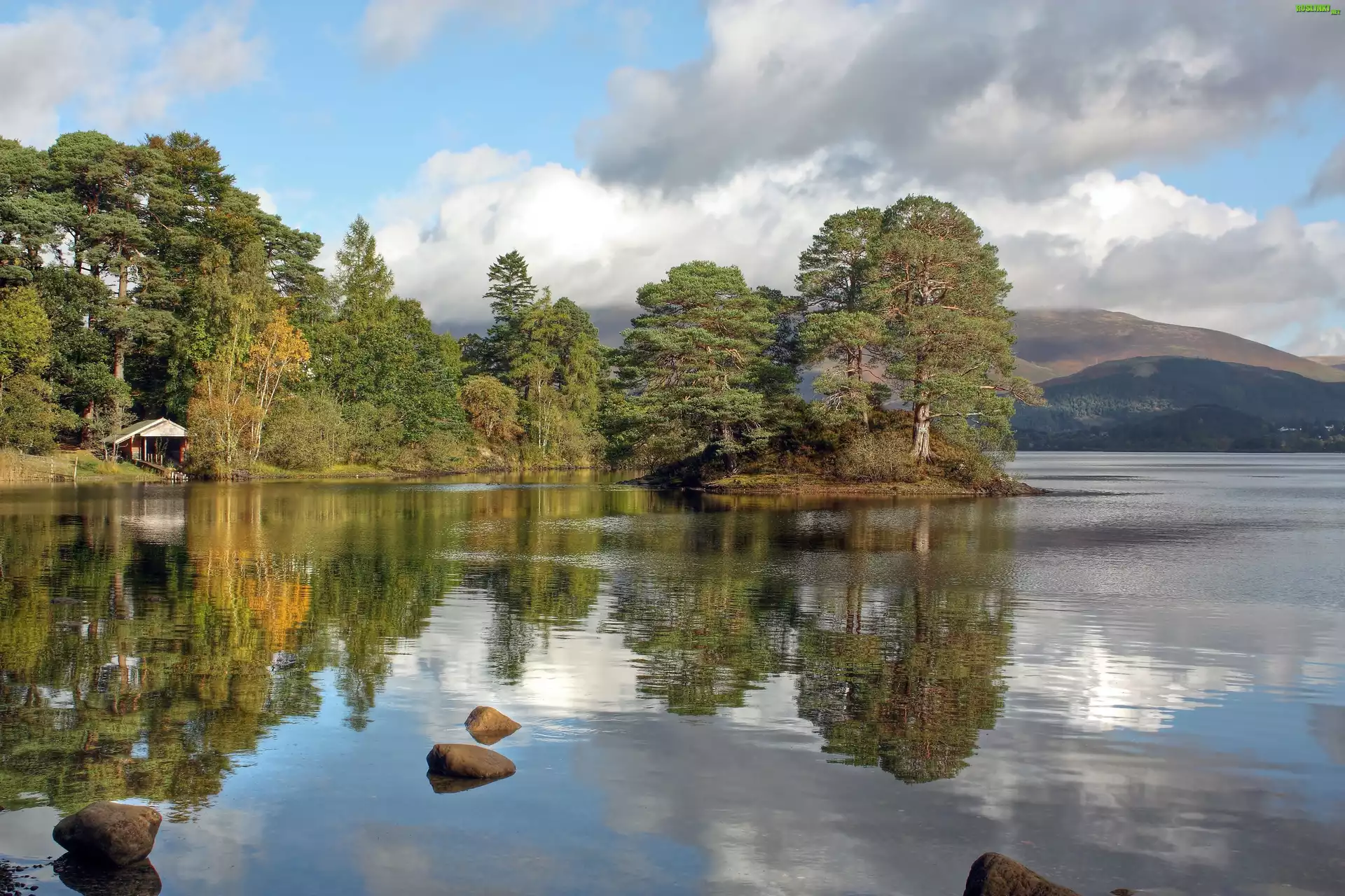 Rośliny: Rzeka, Drzewa, Góry, Kamienie, Dom
