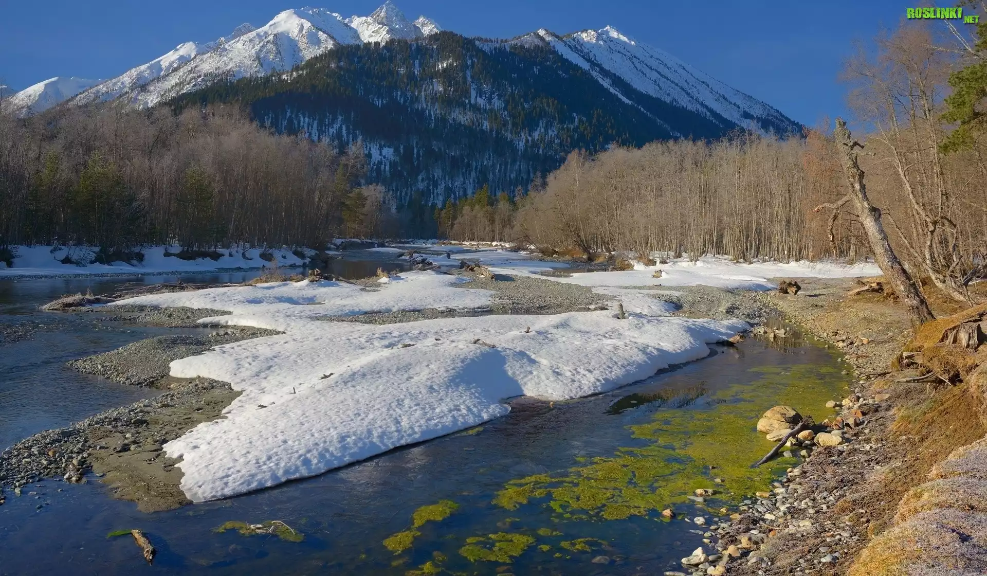 Rośliny: Góry, Kaukaz, Rzeka Psysh, Kamienie, Drzewa, Śnieg, Republika Karaczajo-Czerkiesja, Rosja