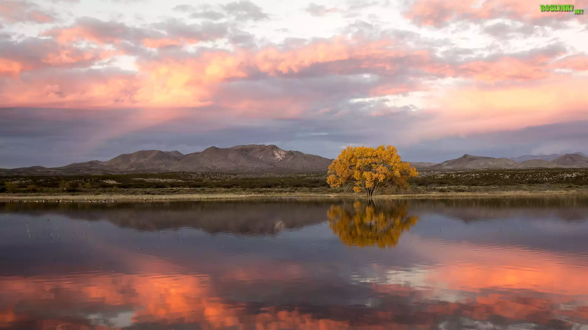 Rzeka Rio Grande, Jesień, Drzewo, Topola kanadyjska, Rezerwat przyrody, Bosque Del Apache, Góry, Wschód słońca, Nowy Meksyk, Stany Zjednoczone |