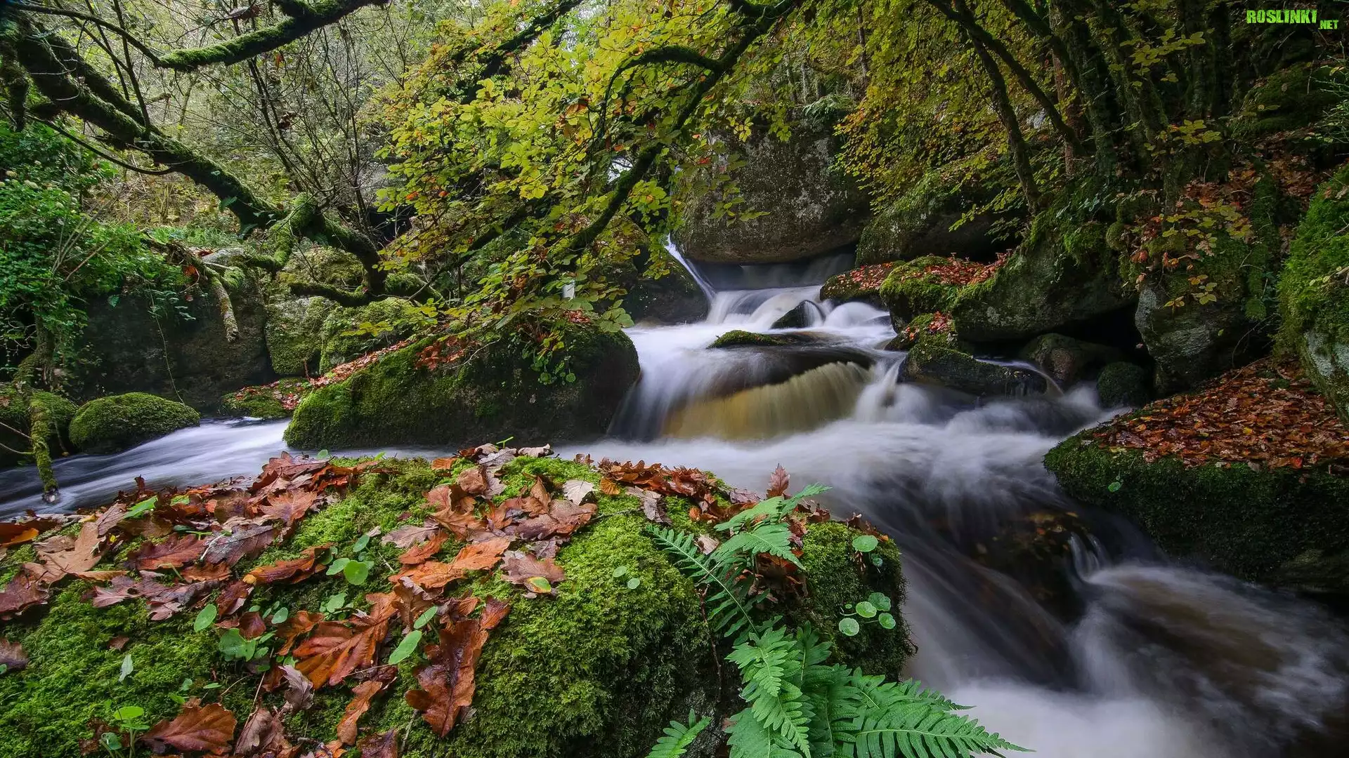 Francja, Bretania, Rzeka Ellez, Kaskady Saint-Herbot, Drzewa, Omszałe, Kamienie, Liście