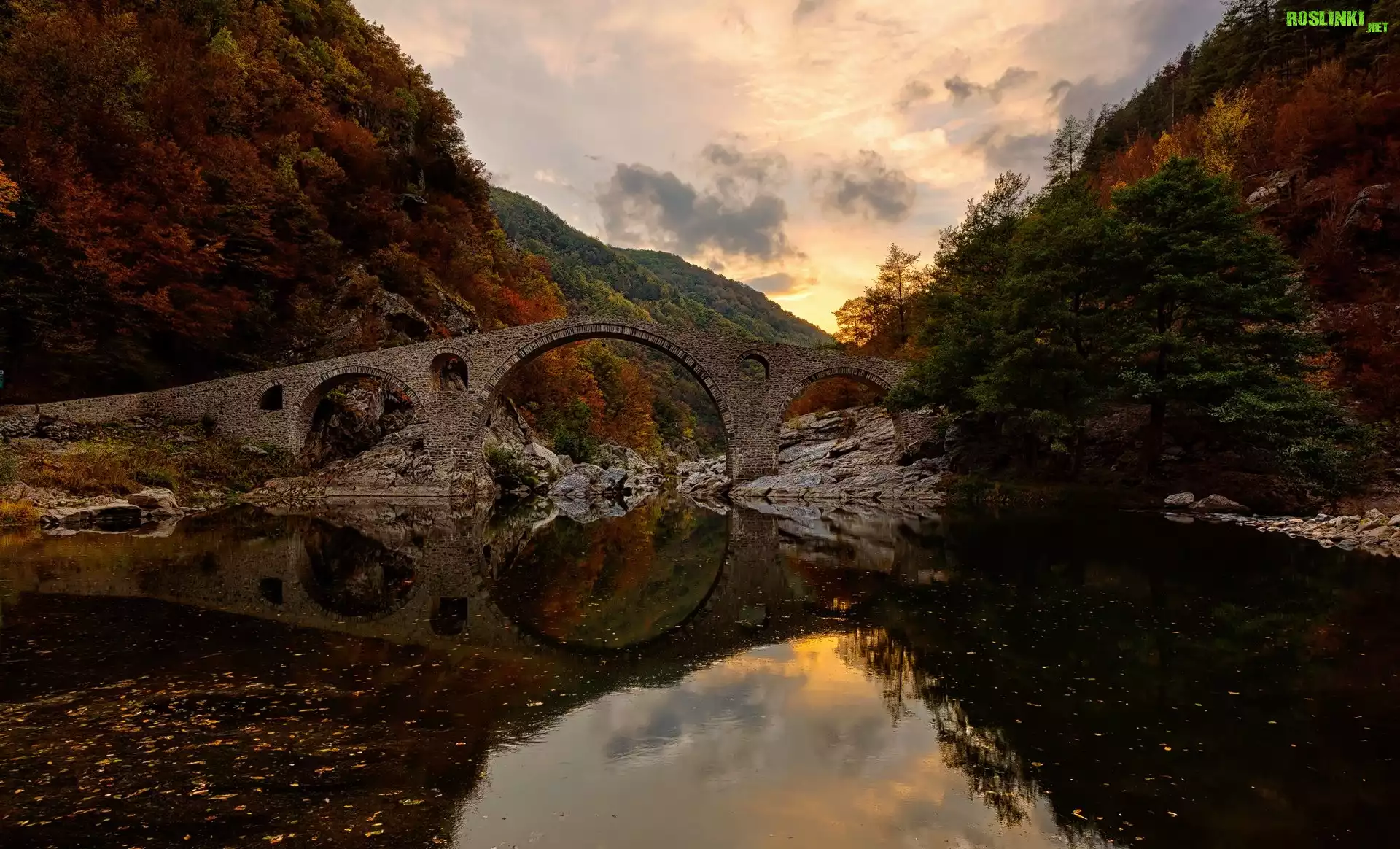 Rzeka Arda, Kamienny, Diabelski Most, Drzewa, Skały, Góry Rodopy, Jesień, Miejscowość Ardino, Obwód Kyrdżali, Bułgaria |