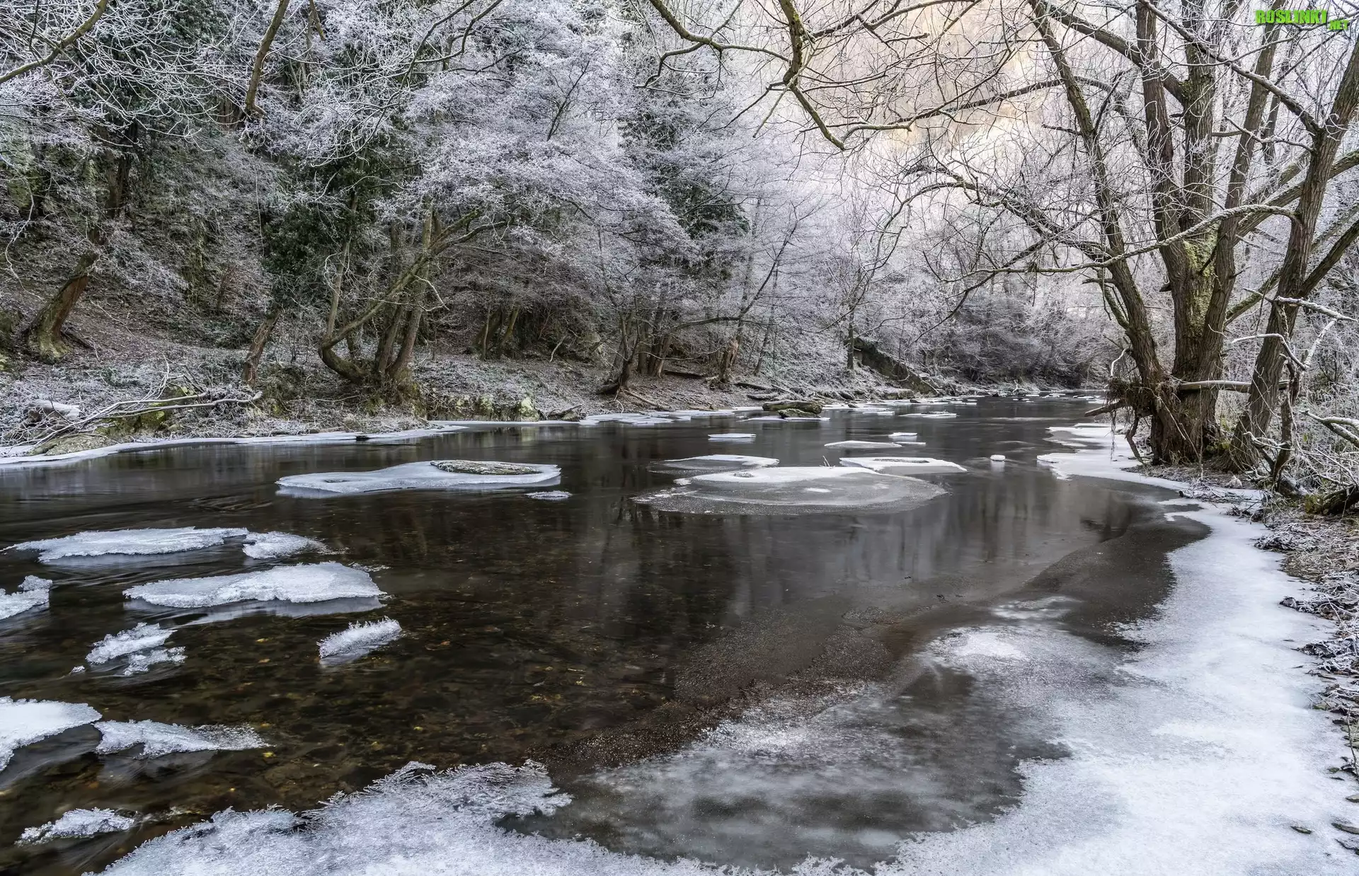 Rośliny: Rzeka, Lód, Drzewa, Las, Zima