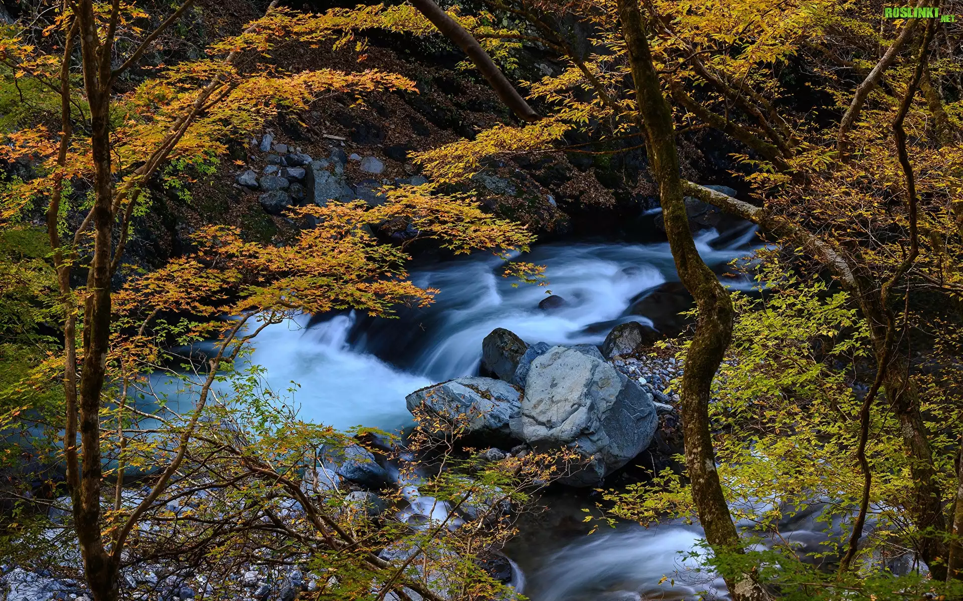 Rośliny: Las, Rzeka, Kamienie, Drzewa, Pożółkłe, Liście, Jesień