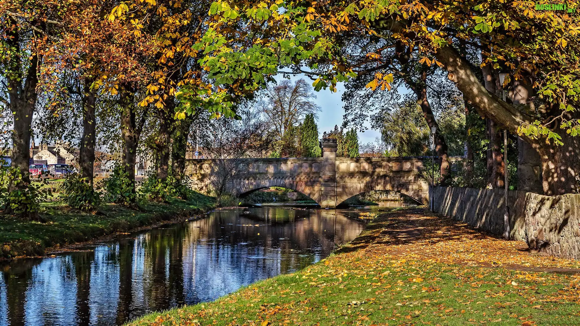 Rośliny: Rzeka, Most, Drzewa, Liście, Jesień