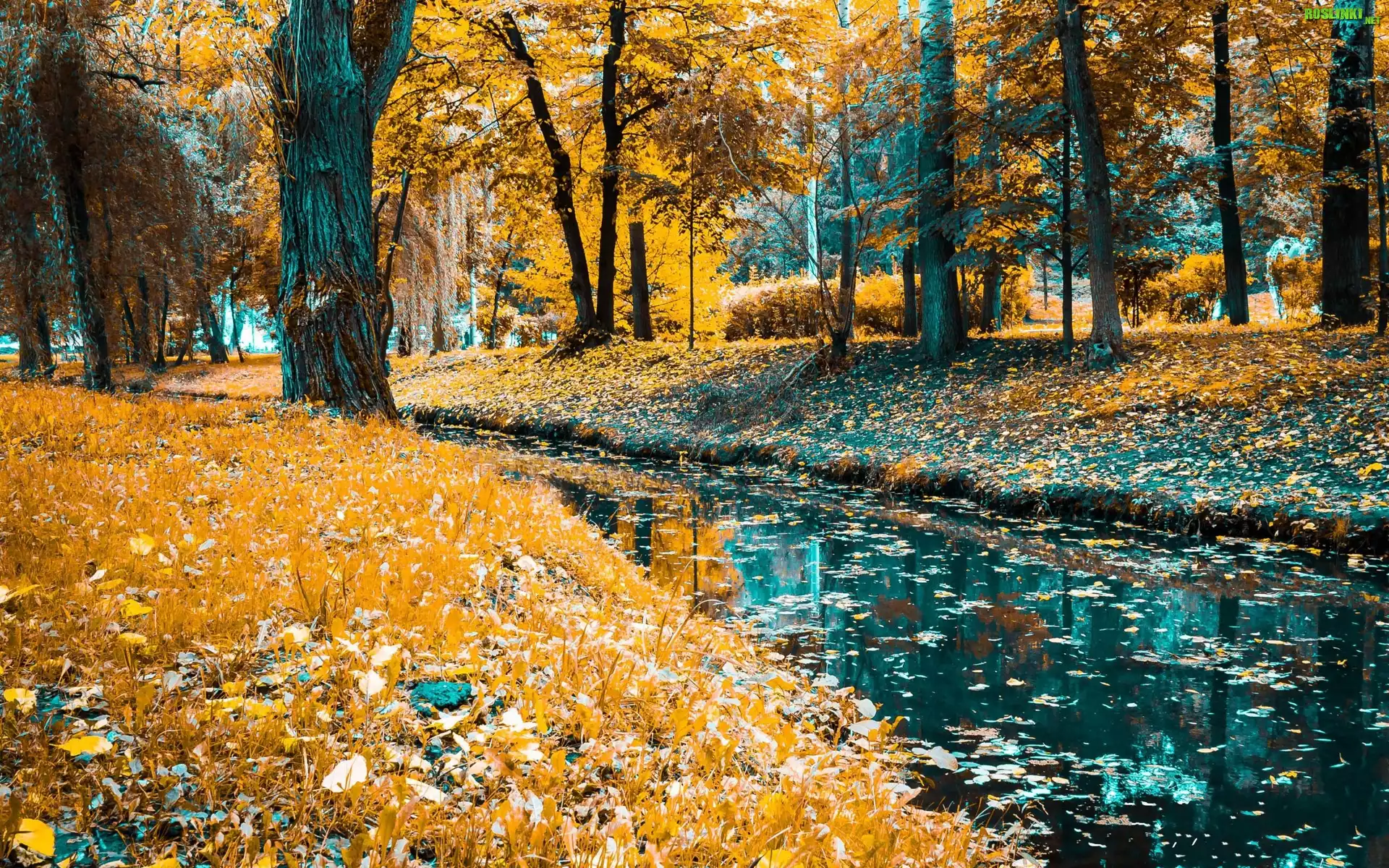 Rośliny: Rzeka, Park, Drzewa, Liście, Jesień