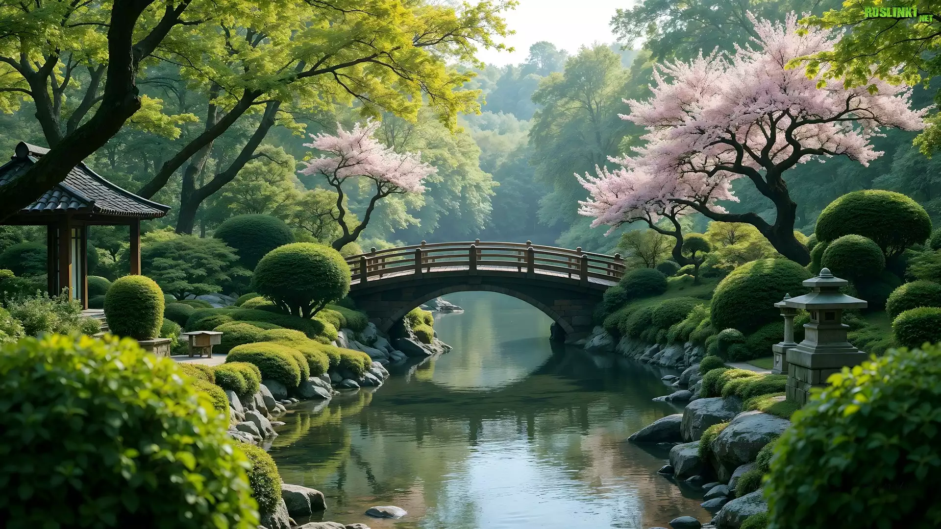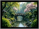 Rośliny: Ogród, Rzeka, Mostek, Drzewa, Krzewy
