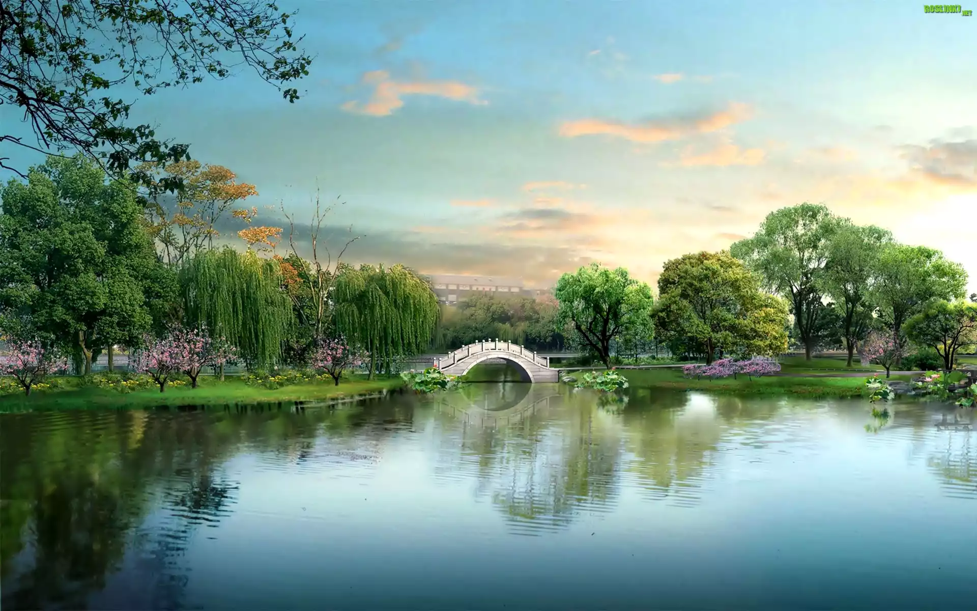 Rośliny: Rzeka, Niebo, Mostek, Drzewa