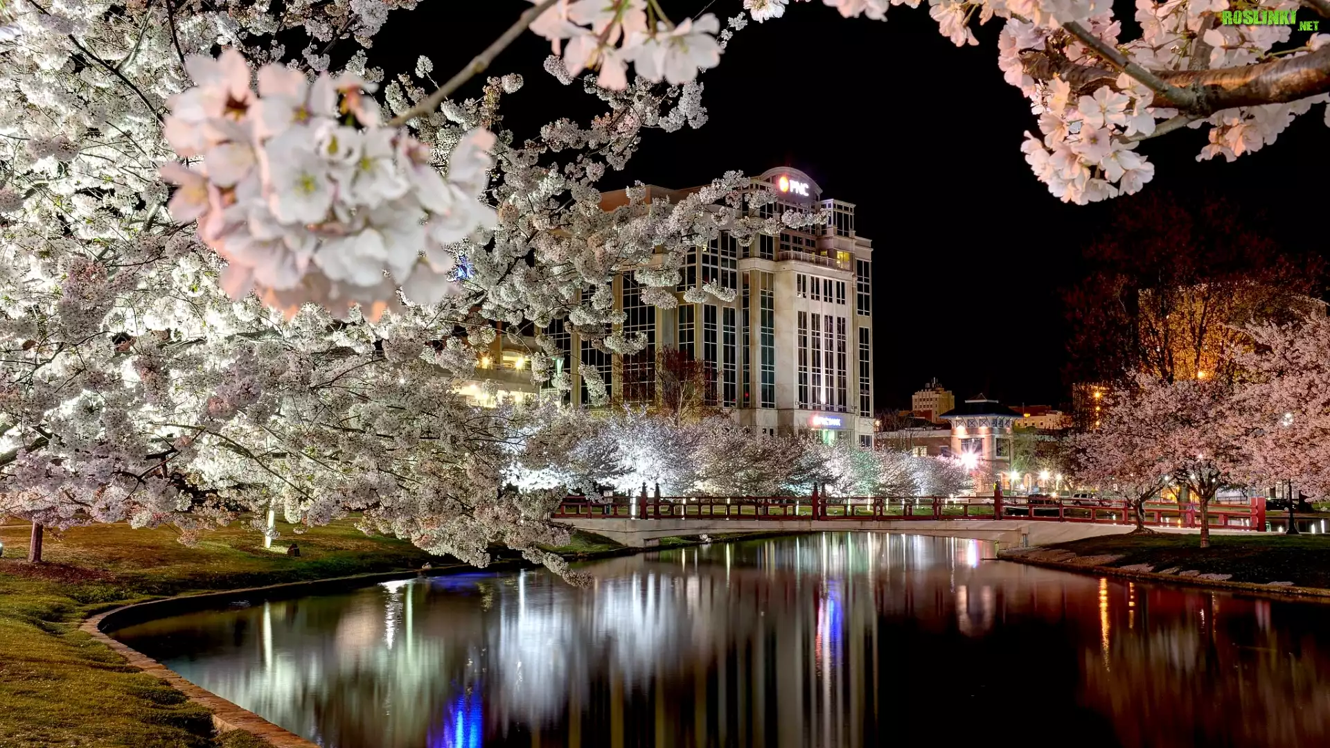Rośliny: Wiosna, Rzeka, Most, Kwitnące, Drzewa, Budynek, Domy, Noc
