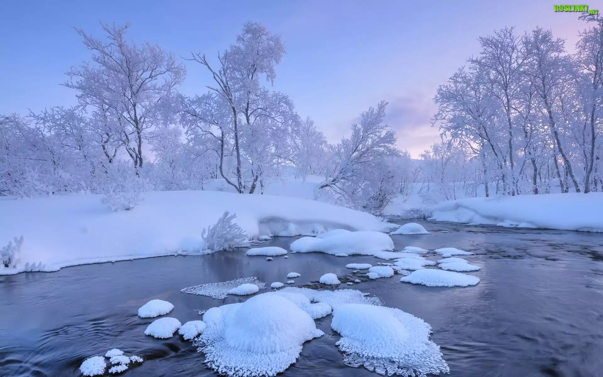Rośliny: Zima, Rzeka, Ośnieżona, Śnieg, Drzewa