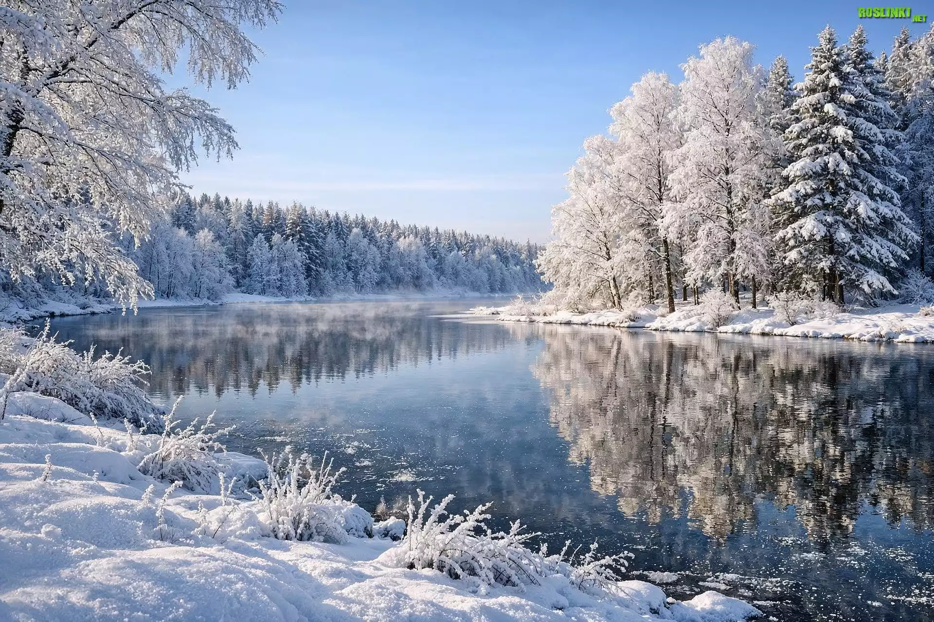 Rośliny: Zima, Rzeka, Oszronione, Drzewa, Odbicie