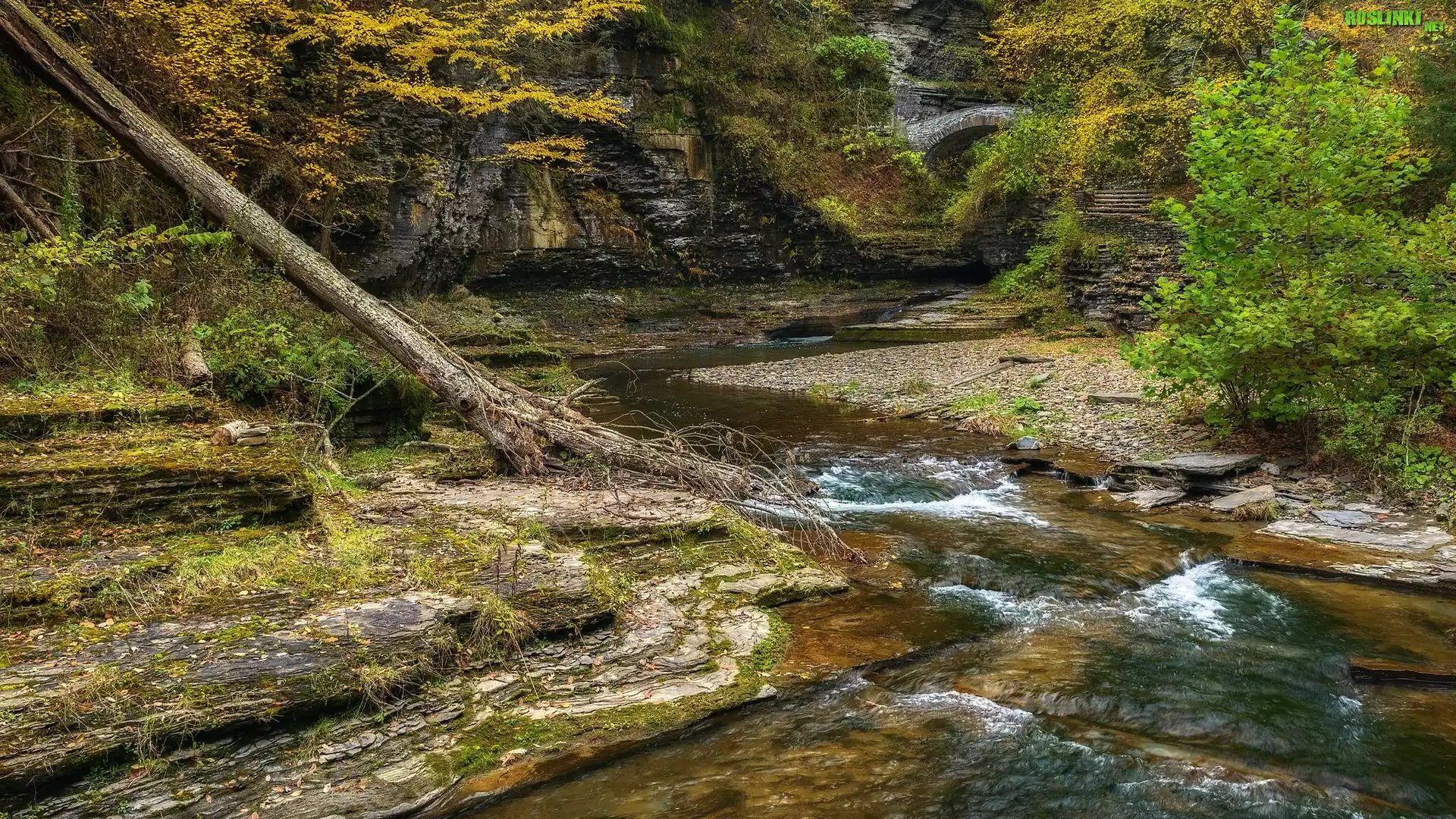 Rzeka, Skały, Rośliny, Powalone, Drzewo