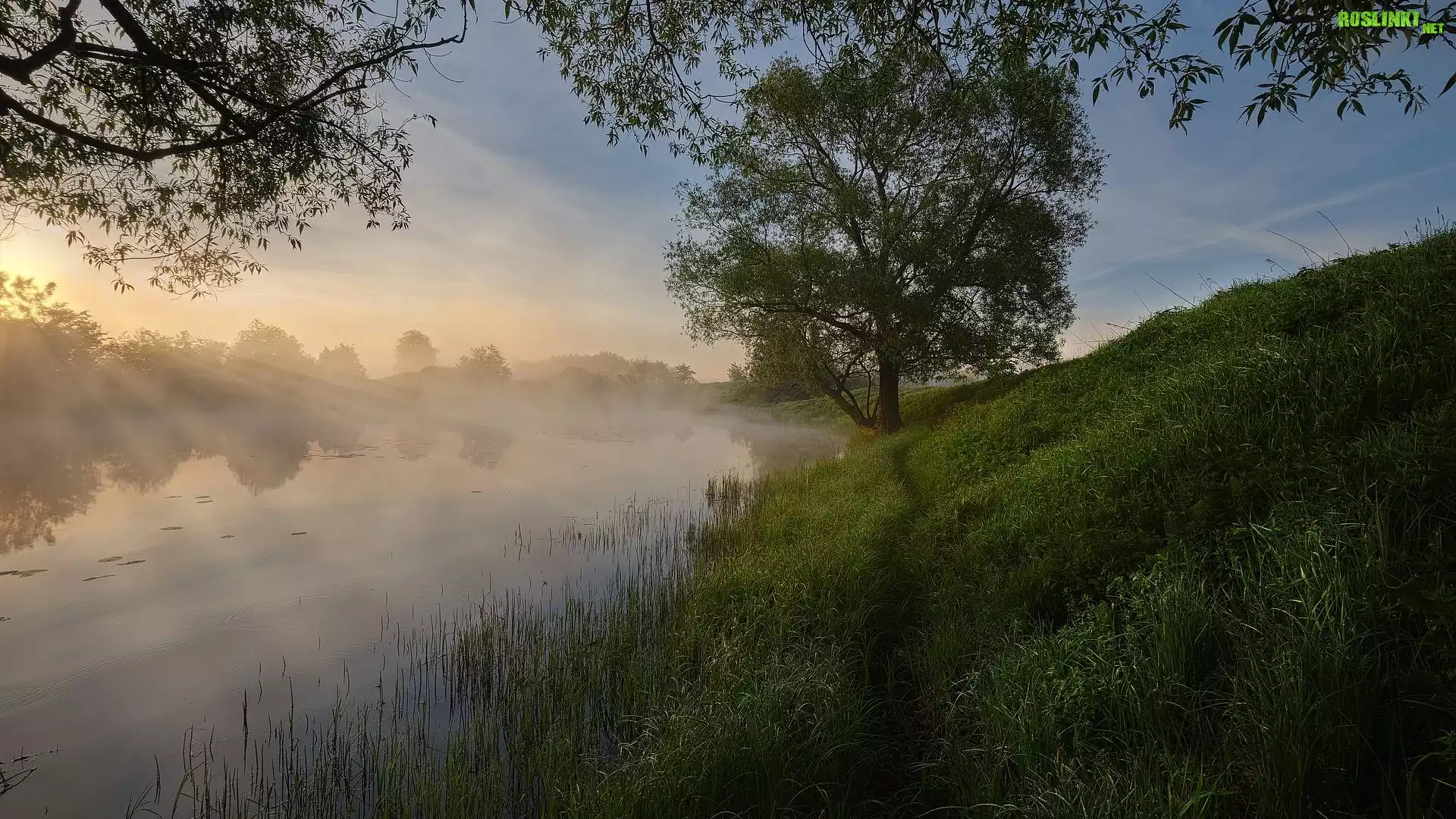 Rośliny: Rzeka, Drzewa, Trawa, Mgła, Przebijające światło