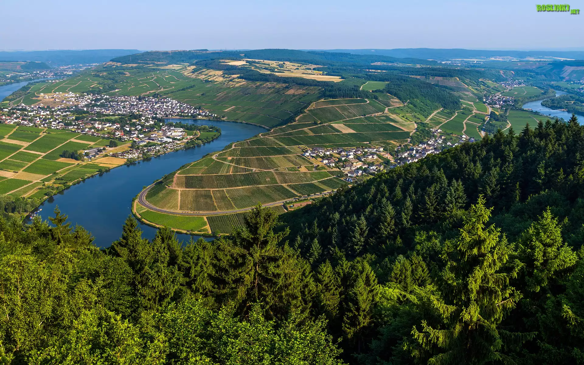 Rzeka Mozela, Meander, Dolina Mozeli, Góry, Miejscowość, Polich, Trier-Saarburg, Domy, Pola, Drzewa, Lasy, Nadrenia-Palatynat, Niemcy |