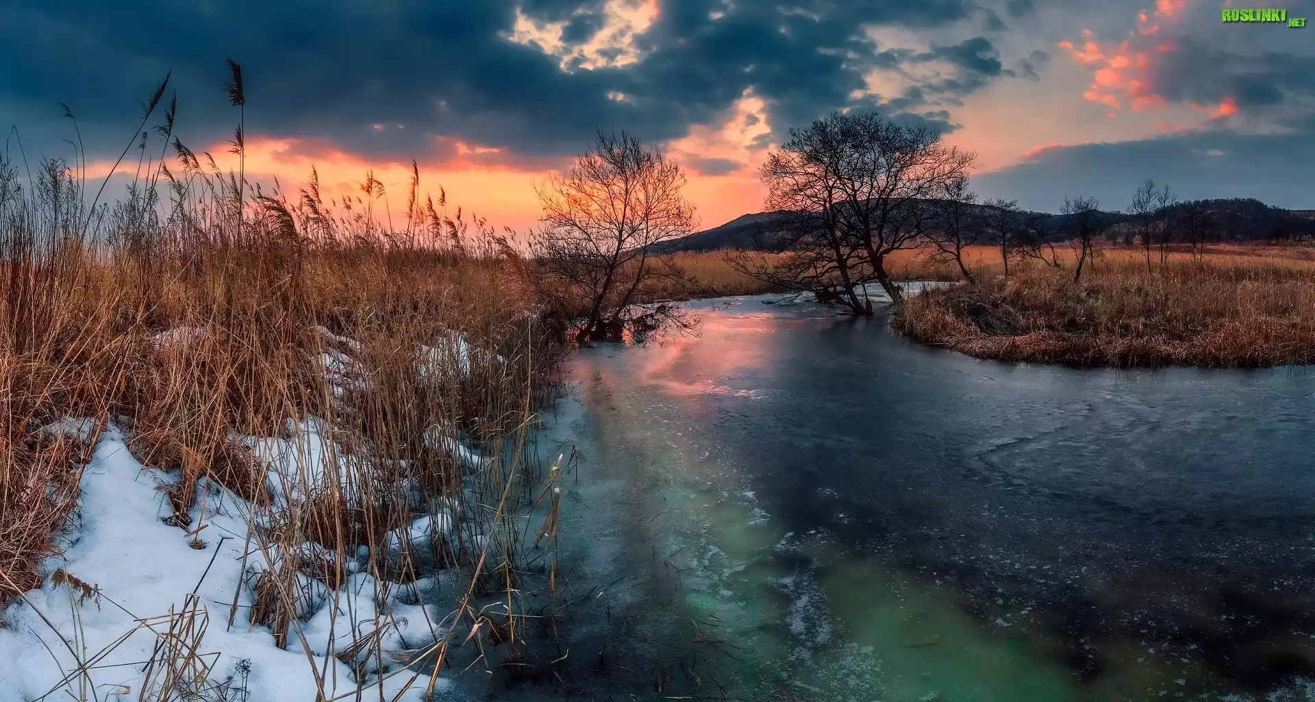 Rośliny: Rzeka, Trawa, Drzewa, Zachód słońca, Wzgórza