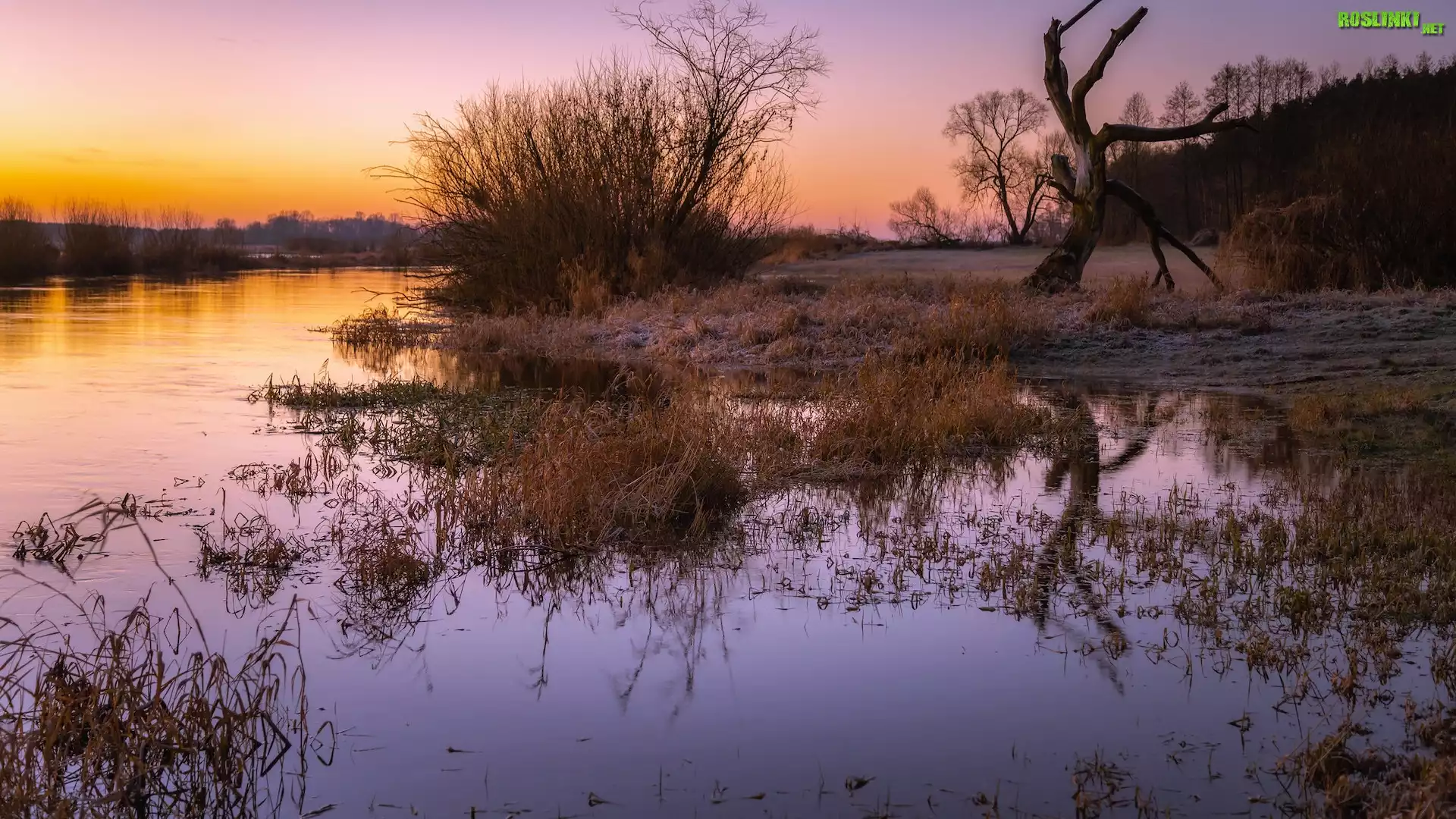 Rośliny: Polska, Rzeka, Biebrza, Szuwary, Krzewy, Drzewa, Wschód słońca