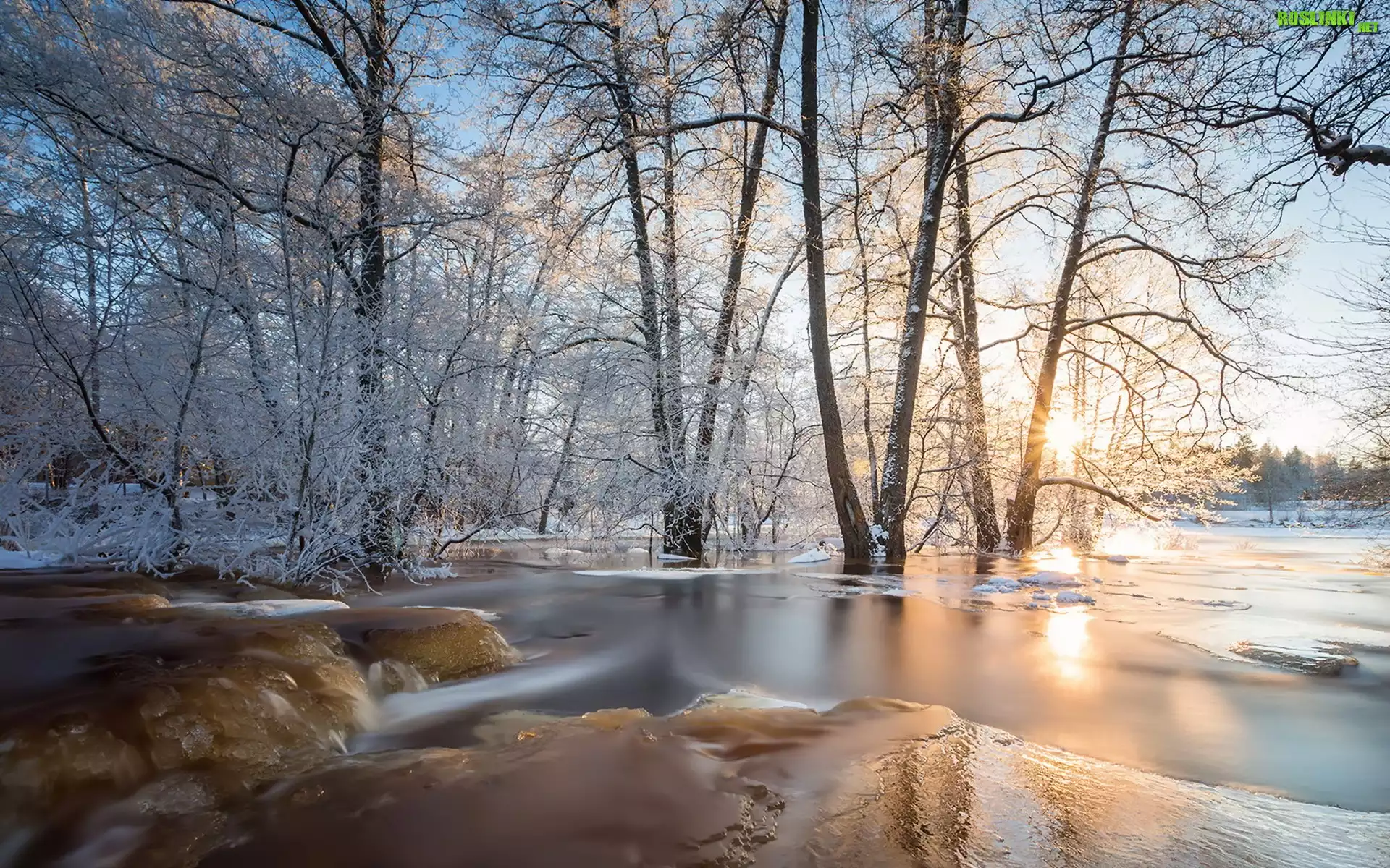 Rzeka, Drzewa, Promienie, Słońca, Zima