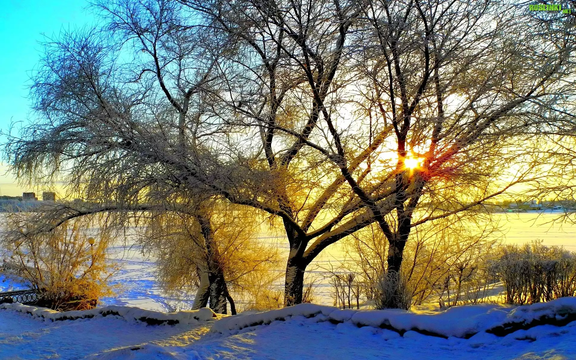 Rośliny: Rzeka, Drzewa, Promienie, Słońca, Zima