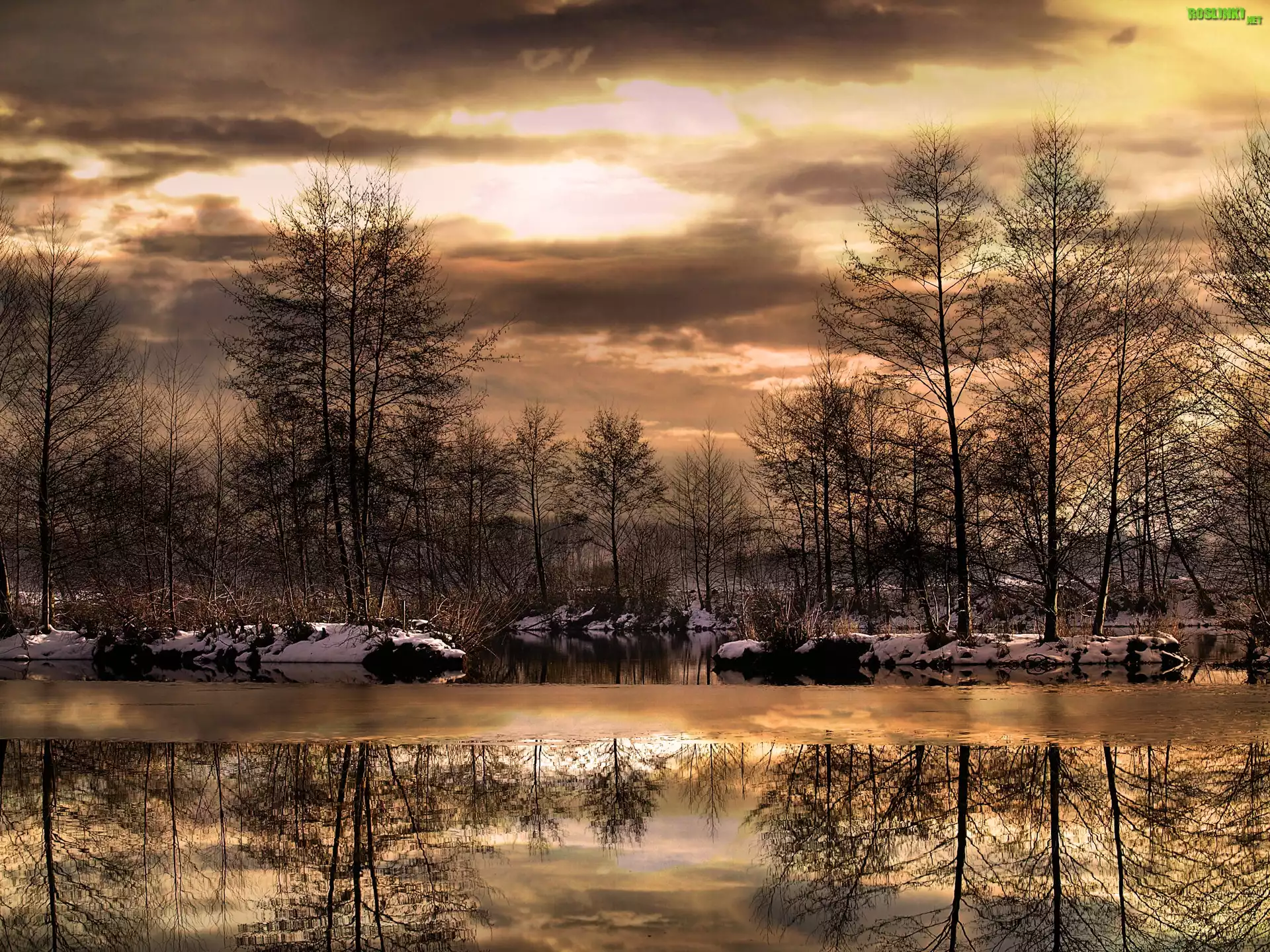 Rośliny: Rzeka, Drzewa, Zachód, Słońca, Śnieg