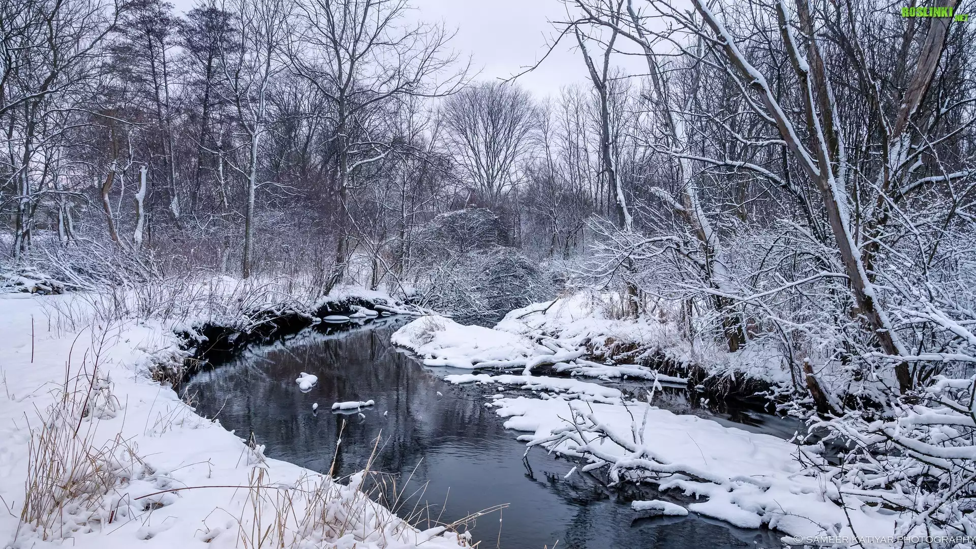 Rośliny: Zima, Rzeka, Śnieg, Drzewa, Krzewy