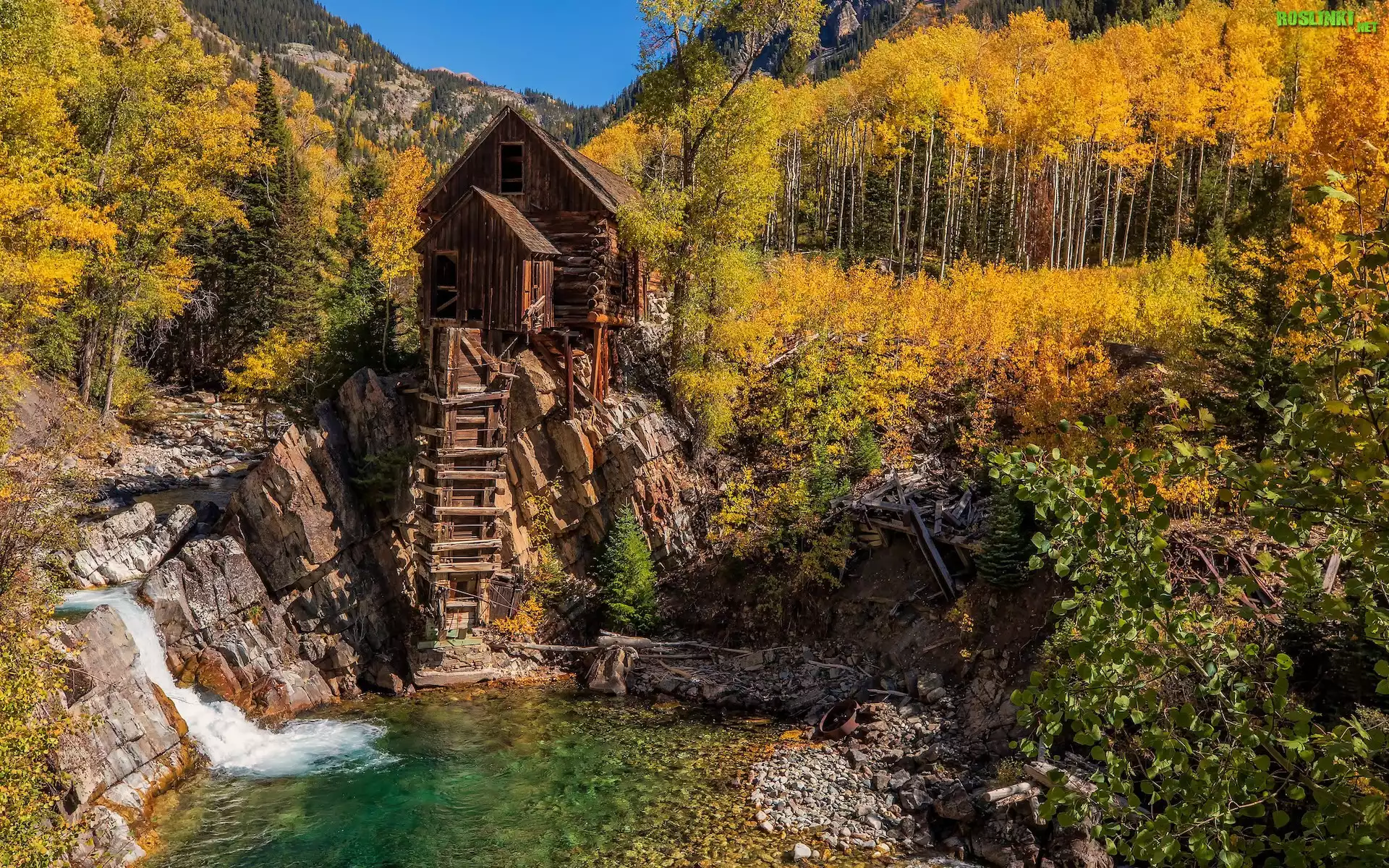 Młyn, Crystal Mill, Rzeka, Crystal River, Jesień, Skały, Drzewa, Stan Kolorado, Stany Zjednoczone |