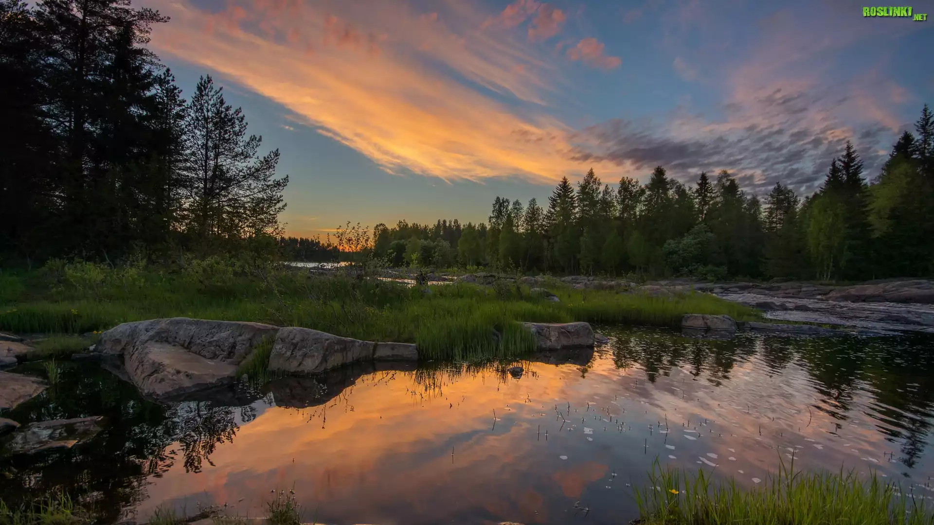 Rośliny: Rzeka, Kamienie, Drzewa, Trawa, Odbicie