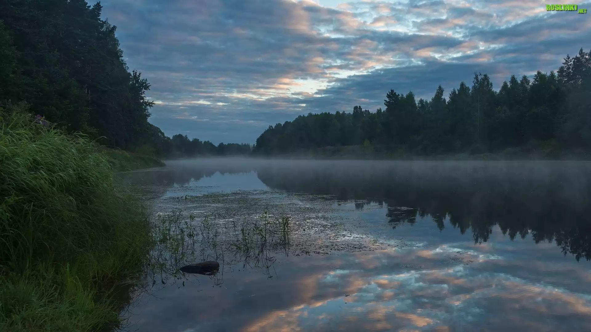 Rośliny: Rzeka, Mgła, Trawa, Drzewa
