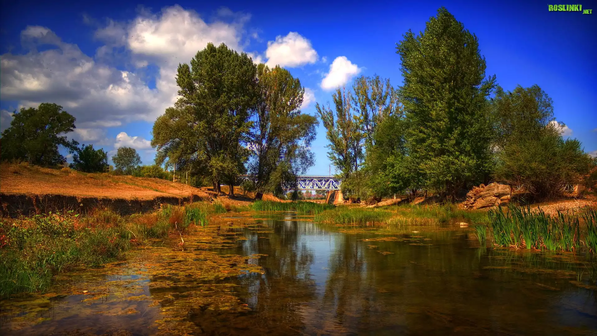 Rośliny: Rzeka, Most, Drzewa, Trawy, Chmury