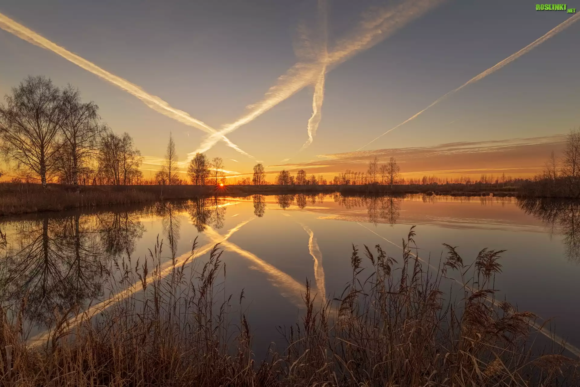Rośliny: Rzeka, Zachód słońca, Drzewa, Trzciny, Odbicie