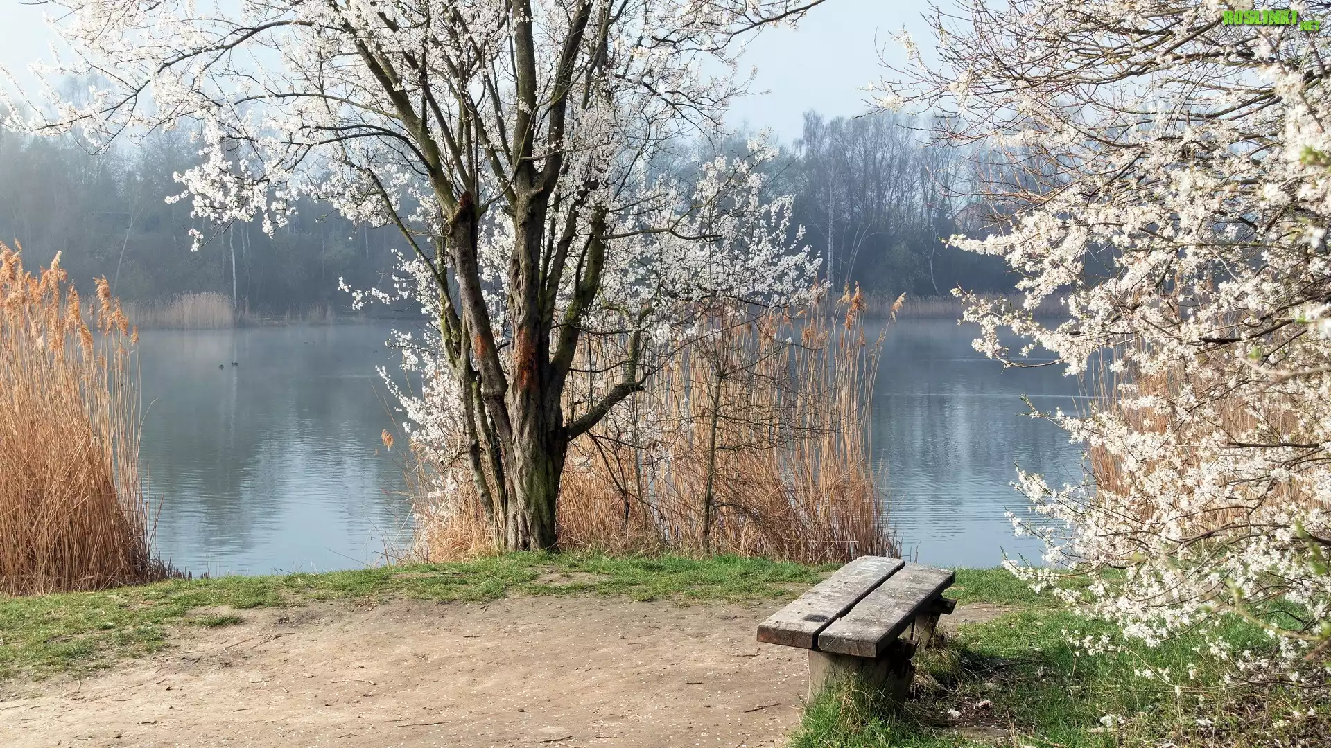 Rośliny: Wiosna, Rzeka, Kwitnące, Drzewa, Wysokie, Trawy, Ławka