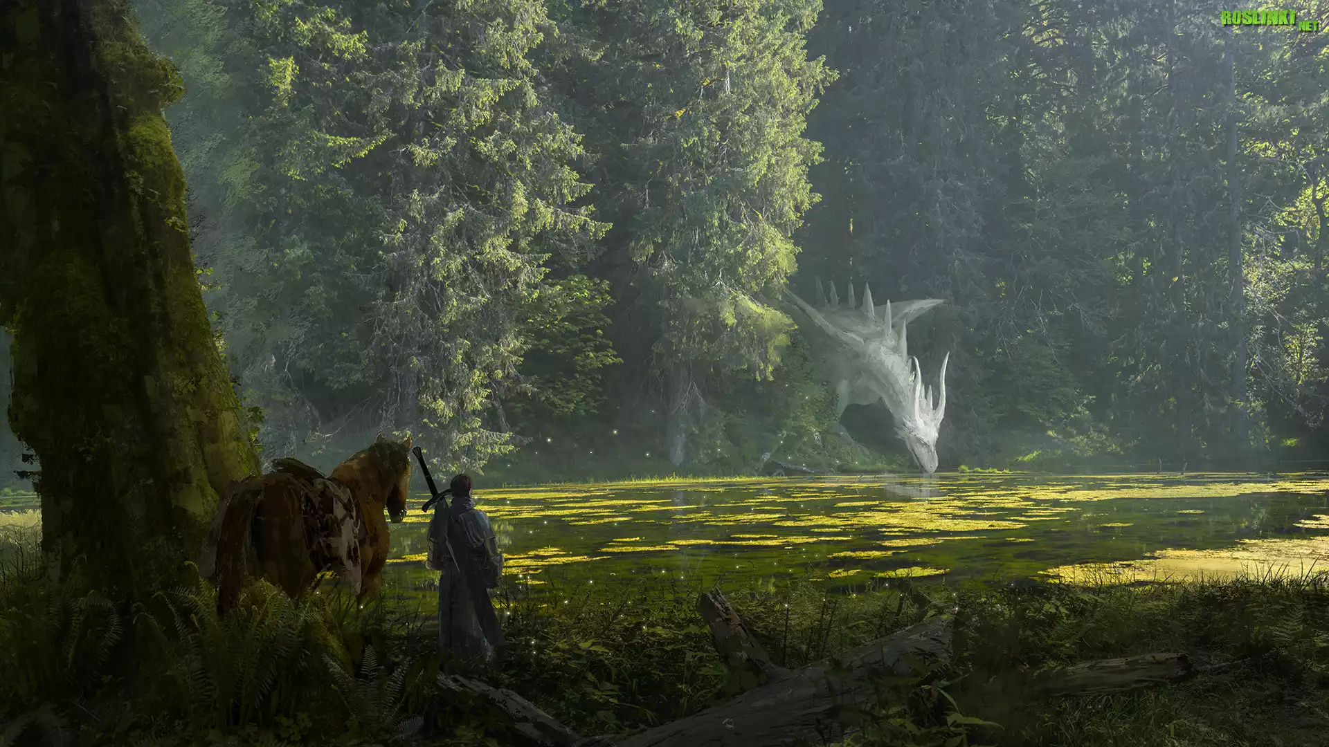 Rzeka, Drzewa, Smok, Koń, Wojownik, Fantasy