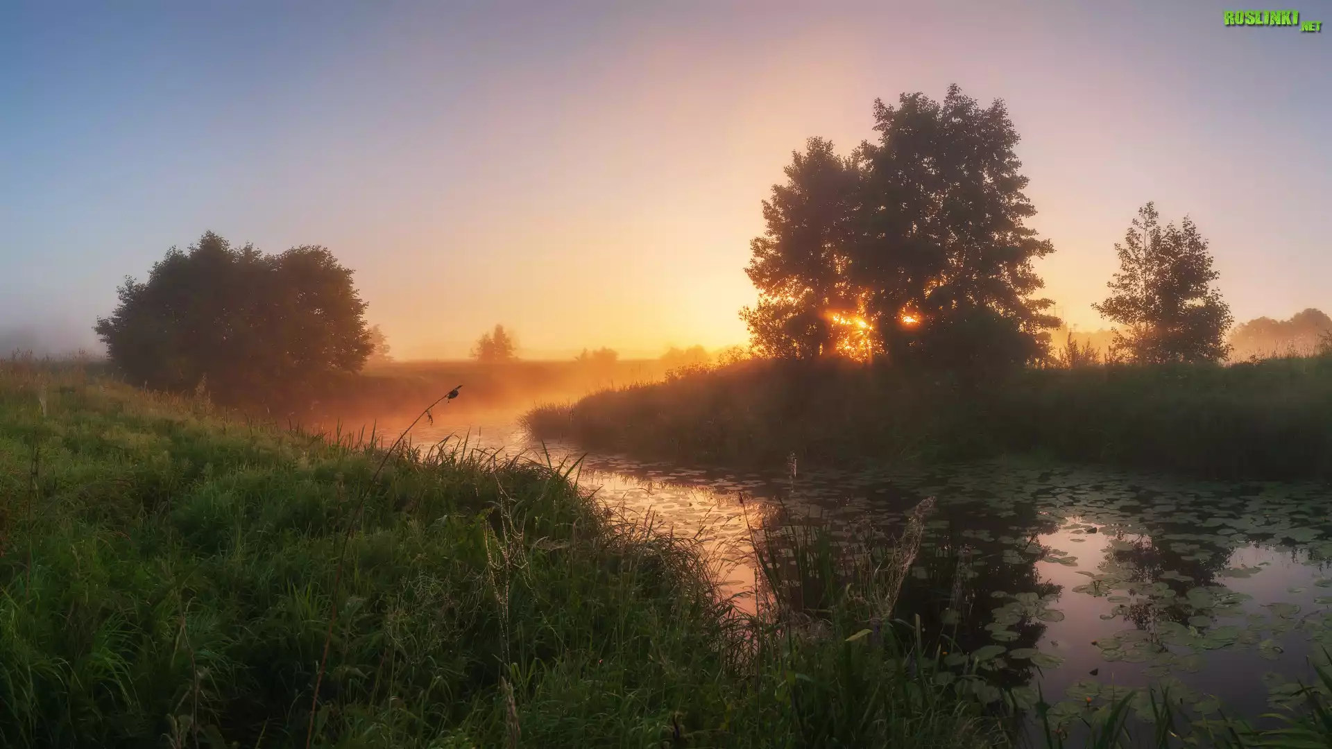 Rzeka, Mgła, Łąka, Drzewa, Wschód słońca