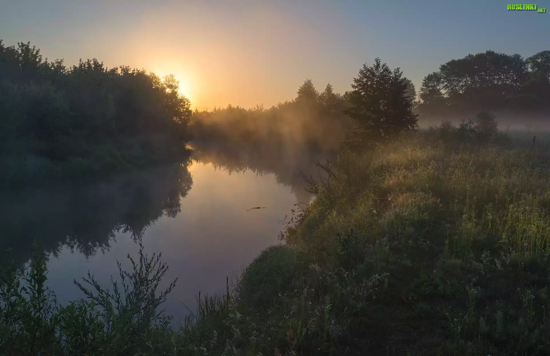 Rośliny: Rzeka, Drzewa, Mgła, Wschód słońca