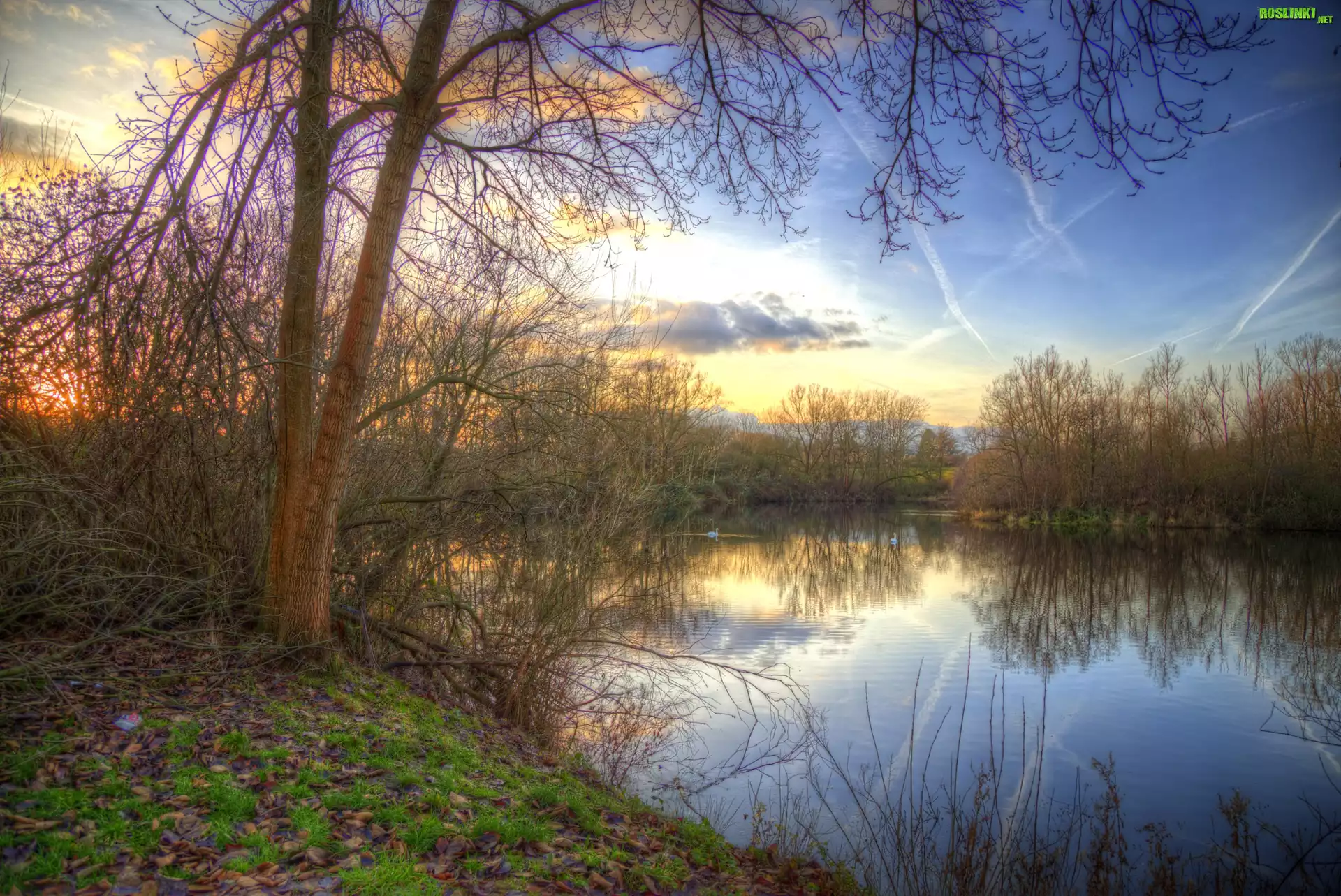 Rośliny: Rzeka, Drzewa, Niebo, Wschód słońca