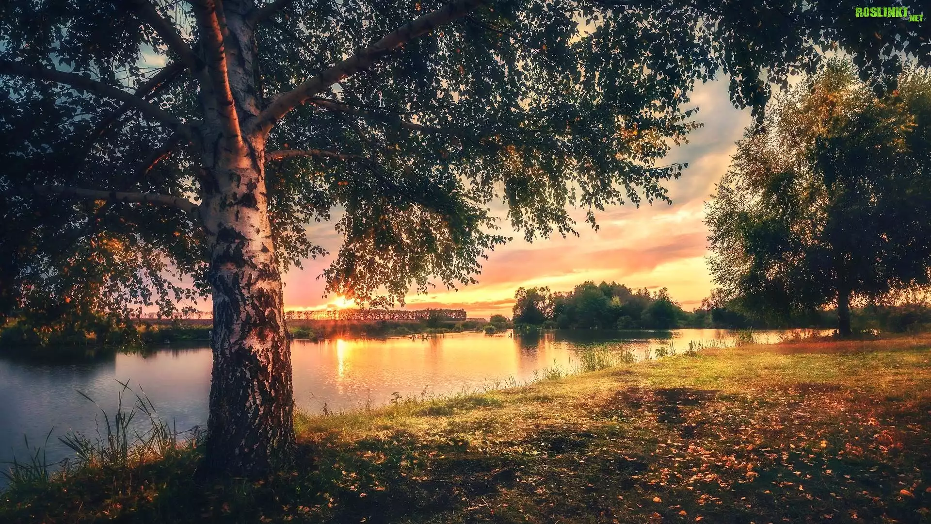 Rośliny: Rzeka, Drzewa, Brzoza, Zachód słońca