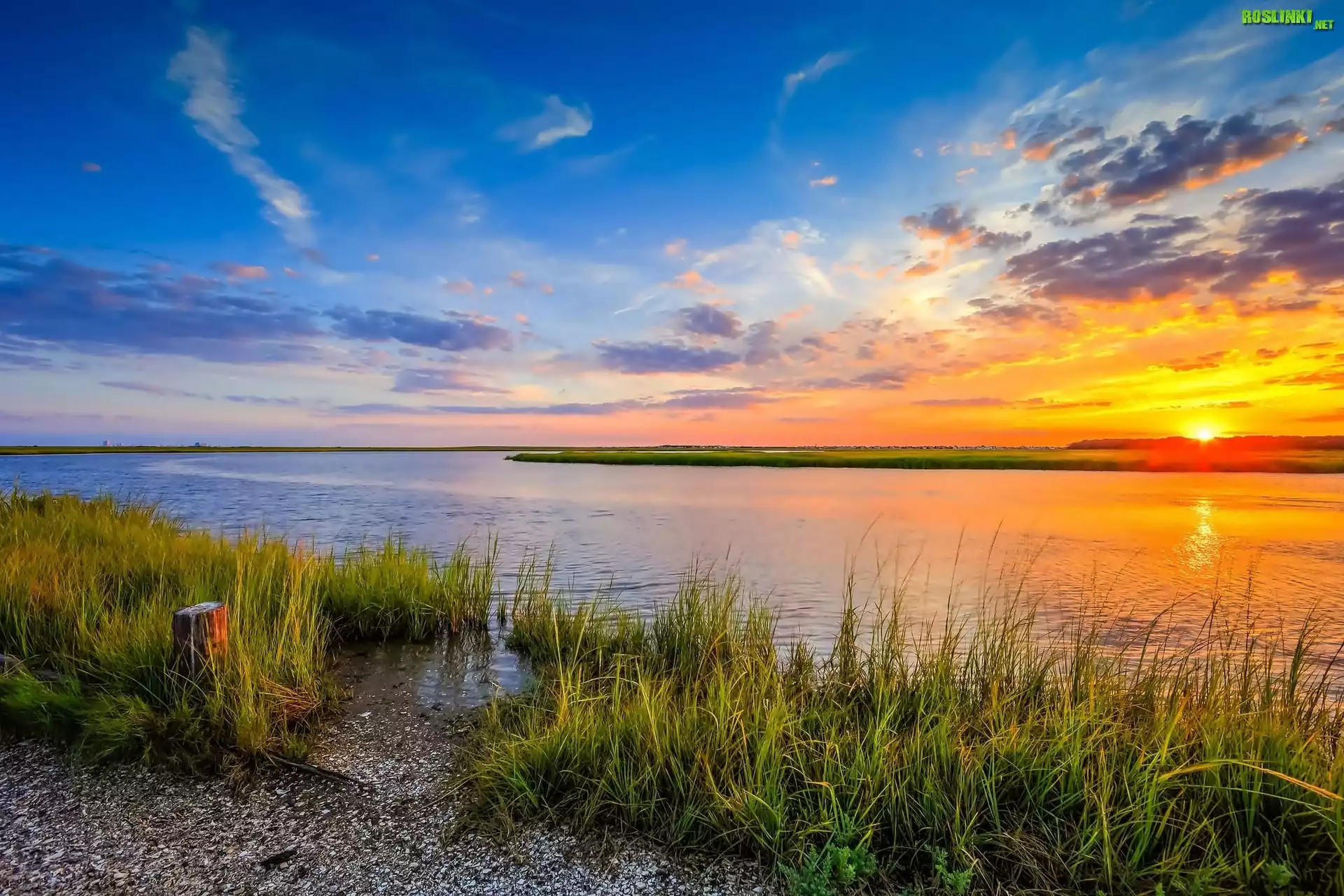 Rośliny: Rzeka, Trawy, Chmury, Zachód, Słońca