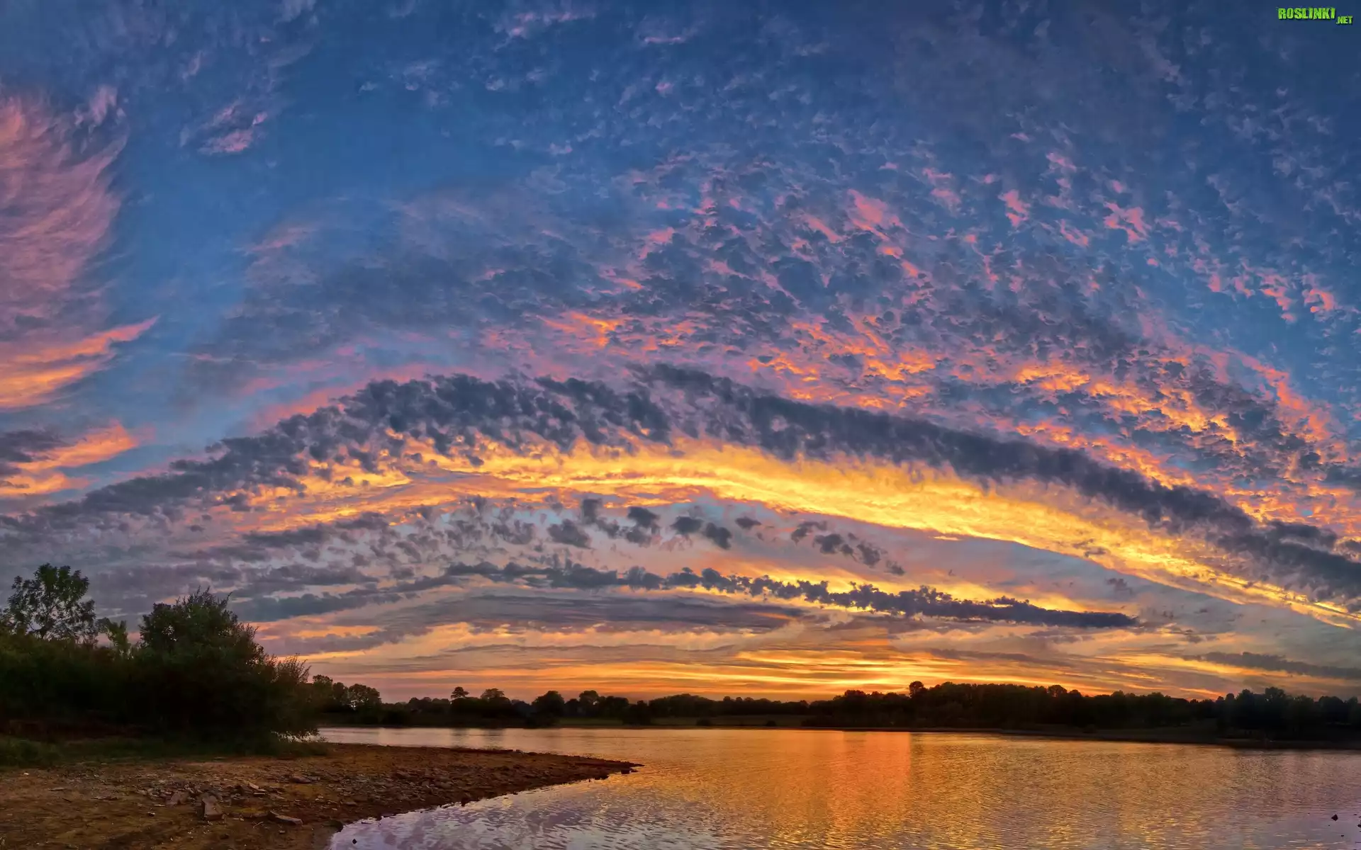Rośliny: Rzeka, Drzewa, Kamienie, Chmury, Zachód, Słońca