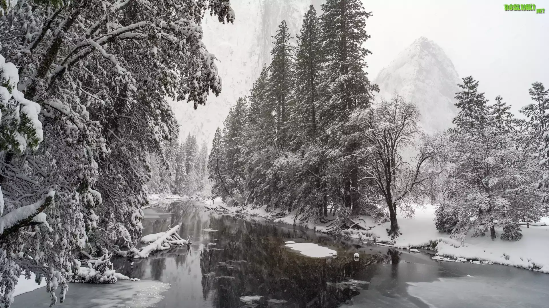 Rośliny: Zima, Rzeka, Drzewa, Góry, Śnieg, Czarno-białe