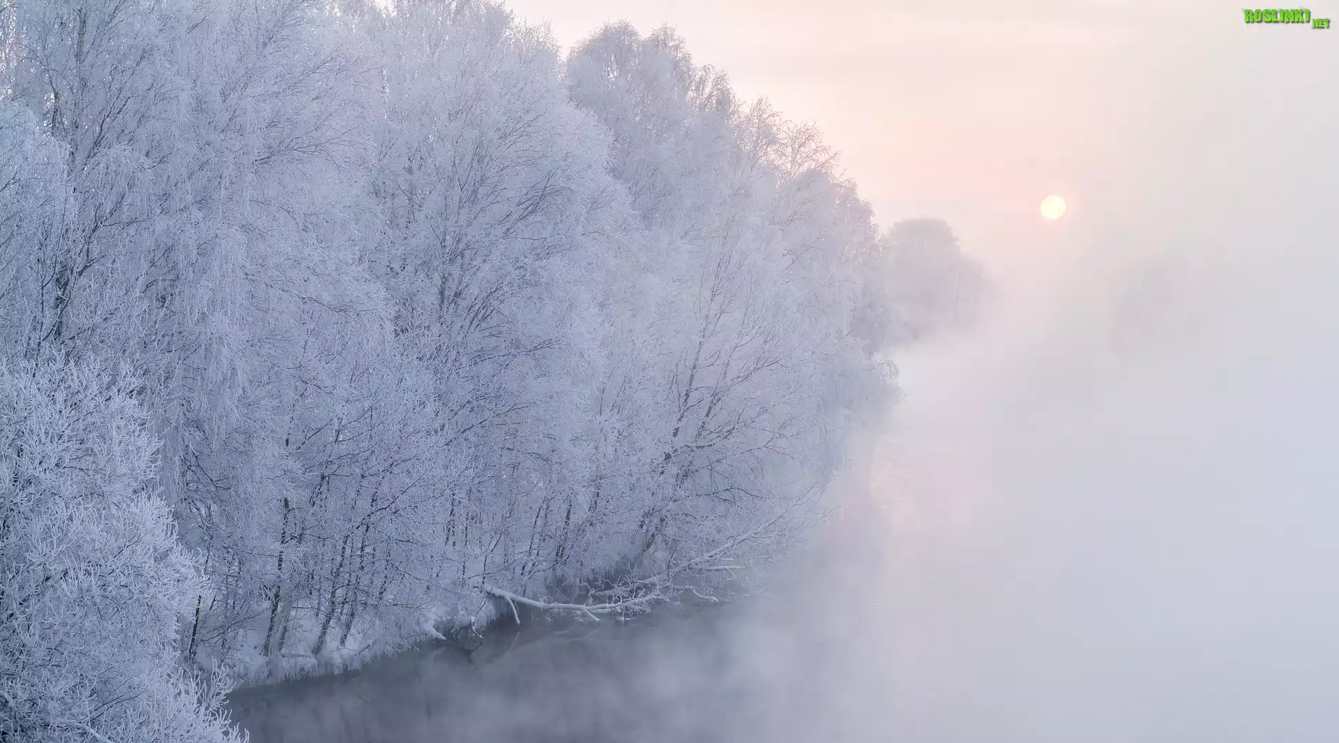 Rośliny: Zima, Rzeka, Drzewa, Szron, Wschód słońca, Mgła